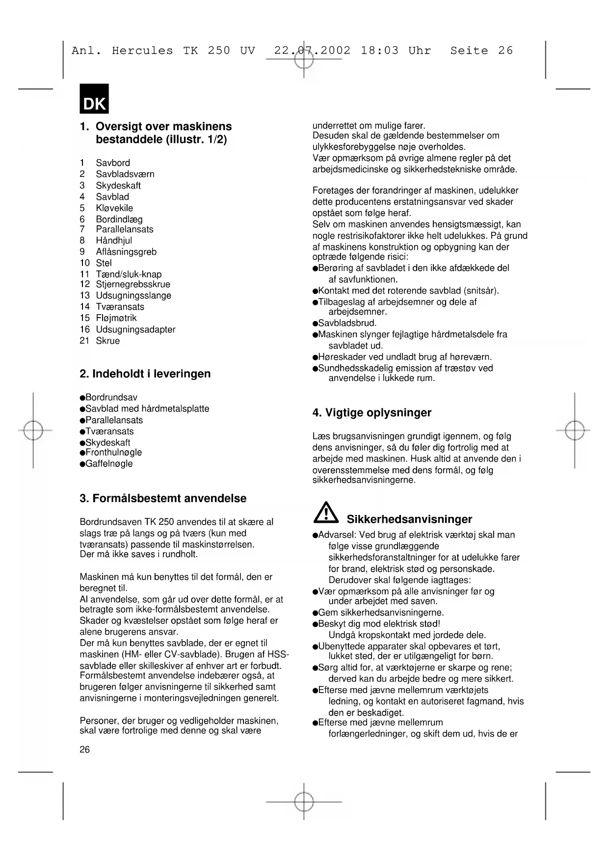 Læs brugsanvisningen grundigt igennem, og følg dens anvisninger, så du føler dig fortrolig med at arbejde med maskinen. Husk altid at anvende den i overensstemmelse med dens formål, og følg sikkerhedsanvisningerne. Sikkerhedsanvisninger Advarsel: Ved brug af elektrisk værktøj skal man følge visse grundlæggende sikkerhedsforanstaltninger for at udelukke farer for brand, elektrisk stød og personskade. Derudover skal følgende iagttages: Vær opmærksom på alle anvisninger før og under arbejdet med saven. Gem sikkerhedsanvisningerne. Beskyt dig mod elektrisk stød! Undgå kropskontakt med jordede dele. Ubenyttede apparater skal opbevares et tørt, lukket sted, der er utilgængeligt for børn. Sørg altid for, at værktøjerne er skarpe og rene; derved kan du arbejde bedre og mere sikkert. Efterse med jævne mellemrum værktøjets ledning, og kontakt en autoriseret fagmand, hvis den er beskadiget. Efterse med jævne mellemrum forlængerledninger, og skift dem ud, hvis de er Anl. Hercules TK 250 UV 22.07.2002 18:03 Uhr Seite 26DK
