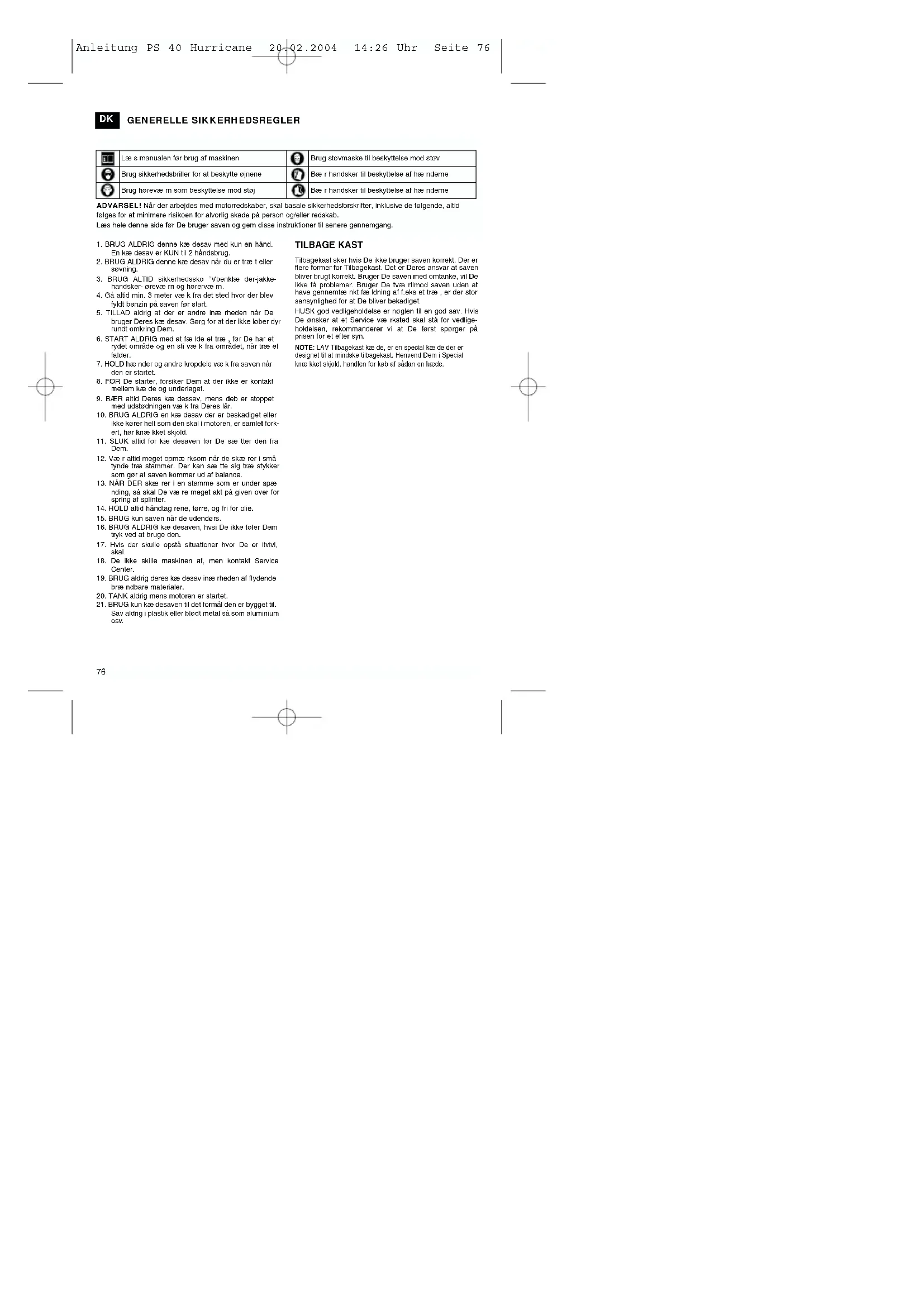 Anleitung PS 40 Hurricane 20.02.2004 14:26 Uhr Seite 76DK Deres kæ de av er fremstillet med en sikkerheds label, placeret på kæ de bremsen. Denne label sammen med instruktioner på disse sider, skal læ ses omhyggeligt før ibrugtagelsen af saven.