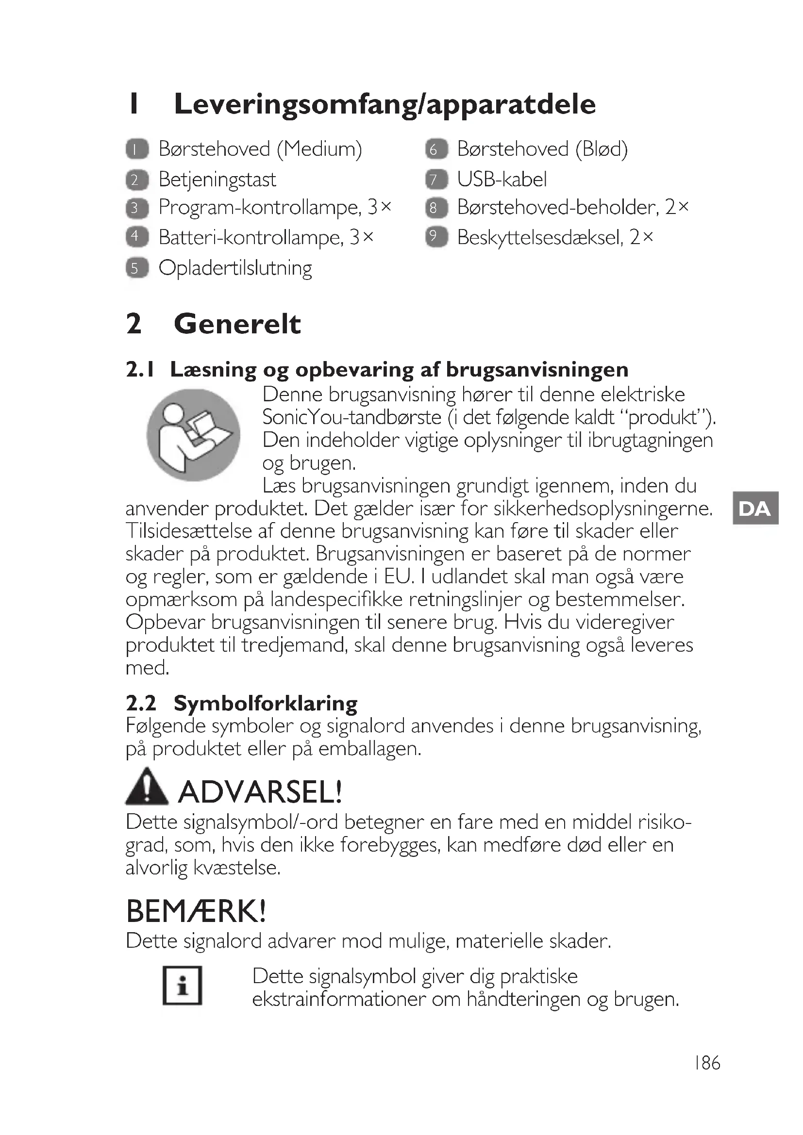 2.1 Læsning og opbevaring af brugsanvisningen _____________________ 186