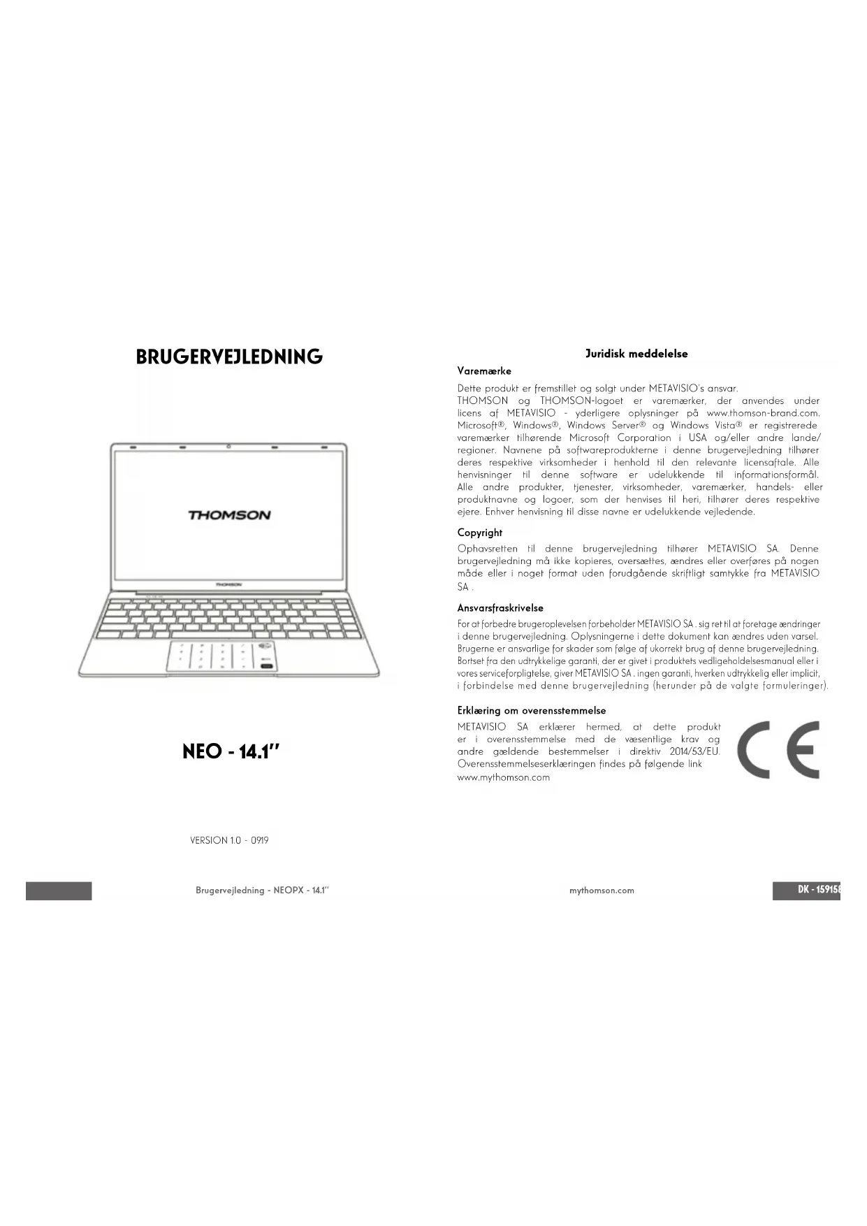 Wir empfehlen, den gesamten Ordner auf einem externen Speichermedium (externe Festplatte, USB-Sticks, CD-R) zu sichern, um eine Kopie dieser Treiber aufzubewahren.DK - 159158 - DK Brugervejledning - NEOPX - 14.1’’ mythomson.com BRUGERVEJLEDNING NEO - 14.1’’ VERSION 1.0 - 0919 Juridisk meddelelse Varemærke Dette produkt er fremstillet og solgt under METAVISIO’s ansvar. THOMSON og THOMSON-logoet er varemærker, der anvendes under licens af METAVISIO - yderligere oplysninger på www.thomson-brand.com. Microsoft®, Windows®, Windows Server® og Windows Vista® er registrerede varemærker tilhørende Microsoft Corporation i USA og/eller andre lande/ regioner. Navnene på softwareprodukterne i denne brugervejledning tilhører deres respektive virksomheder i henhold til den relevante licensaftale. Alle henvisninger til denne software er udelukkende til informationsformål. Alle andre produkter, tjenester, virksomheder, varemærker, handels- eller produktnavne og logoer, som der henvises til heri, tilhører deres respektive ejere. Enhver henvisning til disse navne er udelukkende vejledende. Copyright Ophavsretten til denne brugervejledning tilhører METAVISIO SA. Denne brugervejledning må ikke kopieres, oversættes, ændres eller overføres på nogen måde eller i noget format uden forudgående skriftligt samtykke fra METAVISIO SA . Ansvarsfraskrivelse For at forbedre brugeroplevelsen forbeholder METAVISIO SA . sig ret til at foretage ændringer i denne brugervejledning. Oplysningerne i dette dokument kan ændres uden varsel. Brugerne er ansvarlige for skader som følge af ukorrekt brug af denne brugervejledning. Bortset fra den udtrykkelige garanti, der er givet i produktets vedligeholdelsesmanual eller i vores serviceforpligtelse, giver METAVISIO SA . ingen garanti, hverken udtrykkelig eller implicit, i forbindelse med denne brugervejledning (herunder på de valgte formuleringer). Erklæring om overensstemmelse METAVISIO SA erklærer hermed, at dette produkt er i overensstemmelse med de væsentlige krav og andre gældende bestemmelser i direktiv 2014/53/EU. Overensstemmelseserklæringen ndes på følgende link www.mythomson.comDK - 161160 - DK Brugervejledning - NEOPX - 14.1’’ mythomson.com - Vigtige sikkerhedsanvisninger - Denne enhed skal bruges i et miljø, hvor den omgivende temperatur er mellem 5 °C (41 °F) og 35 °C (95 °F). Udsæt ikke enheden for regn eller fugt, og hold den væk fra væsker. Hvis der spildes vand eller andre væsker på apparatet, skal du straks slukke for strømmen og vente, indtil apparatet er helt tørt, før du tænder det igen. Udsæt ikke enheden for direkte sollys. Brug ikke stærke opløsningsmidler, ydende rengøringsmidler eller andre kemikalier på eller i nærheden af enhedens overade for at undgå korrosion eller skader på enhedens overade. Udsæt ikke enheden for støvede omgivelser. Brug ikke apparatet under en gaslækage. Udsæt ikke enheden for stærke magnetiske eller elektriske felter. Du kan lade enheden passere gennem lufthavnens røntgendetektorer. Det anbefales dog, at du ikke fører din enhed gennem magnetiske detektionsportaler eller udsætter den for håndholdte detektorer. Der må ikke placeres genstande på enheden. Placer ikke enheden på et ujævnt eller ustabilt underlag. Sørg for at beskytte enheden mod at falde ned eller på anden måde blive beskadiget. Lad ikke enheden være tændt eller opladet på dit skød eller andre dele af kroppen for at undgå varmerelaterede skader. Sluk for apparatet, før du transporterer det eller dækker det med et materiale, der ikke giver optimal luftcirkulation. Brug ikke beskadigede netkabler, tilbehør eller andre enheder sammen med enheden. Vi anbefaler, at du kun bruger det tilbehør (strømforsyning, kabler osv.), der leveres sammen med enheden. Brug kun originale batterier. Udskiftning af batteriet med et forkert batteri kan medføre risiko for eksplosion Du må ikke selv adskille, ændre eller reparere enheden, da dette kan medføre, at garantien bortfalder. Du bedes sikkerhedskopiere dit vigtige indhold regelmæssigt for at undgå tab af data. Vores virksomhed påtager sig intet ansvar for tab eller sletning af elementer, der er indeholdt i enheden som følge af forkert brug af hardware eller software, manglende vedligeholdelse eller andre utilsigtede hændelser. Dette produkt er designet til at muliggøre korrekt genbrug af dele og komponenter. Symbolet med den overstregede skraldespand på hjul angiver, at apparatet ikke må bortskaffes sammen med husholdningsaffald. Se de lokale regler for bortskaffelse af elektronisk udstyr. Symbolet med den overstregede skraldespand på hjul angiver, at batteriet ikke må bortskaffes med det kommunale affald. Se de lokale regler for bortskaffelse af batterier. For at undgå mulige høreskader må du ikke lytte til høje lydniveauer i længere tid.DK - 163162 - DK Brugervejledning - NEOPX - 14.1’’ mythomson.com - Præsentation af anordningen - Forside Venstre side Højre visning Bemærk: Enhedens udseende og visse funktioner kan variere alt efter land, model eller version.