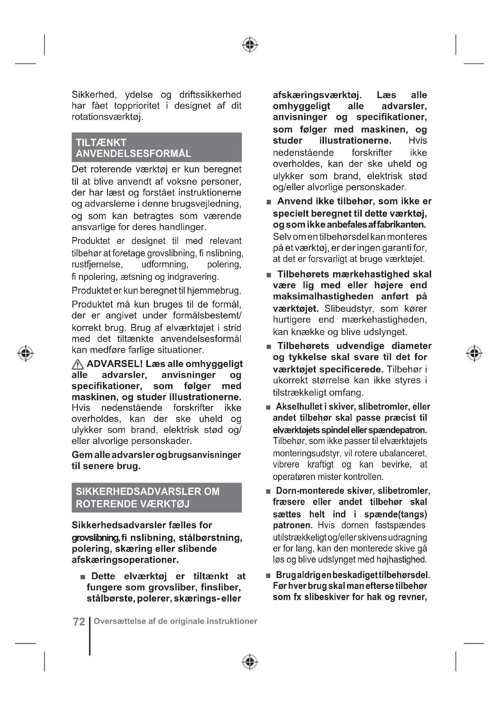 ELSikkerhed, ydelse og driftssikkerhed har fået topprioritet i designet af dit rotationsværktøj. TILTÆNKT ANVENDELSESFORMÅL Det roterende værktøj er kun beregnet til at blive anvendt af voksne personer, der har læst og forstået instruktionerne og advarslerne i denne brugsvejledning, og som kan betragtes som værende ansvarlige for deres handlinger. Produktet er designet til med relevant tilbehør at foretage grovslibning, fi nslibning, rustfjernelse, udformning, polering, fi npolering, ætsning og indgravering. Produktet er kun beregnet til hjemmebrug. Produktet må kun bruges til de formål, der er angivet under formålsbestemt/ korrekt brug. Brug af elværktøjet i strid med det tiltænkte anvendelsesformål kan medføre farlige situationer. ADVARSEL! Læs alle omhyggeligt alle advarsler, anvisninger og specifikationer, som følger med maskinen, og studer illustrationerne. Hvis nedenstående forskrifter ikke overholdes, kan der ske uheld og ulykker som brand, elektrisk stød og/ eller alvorlige personskader. Gem alle advarsler og brugsanvisninger til senere brug. SIKKERHEDSADVARSLER OM