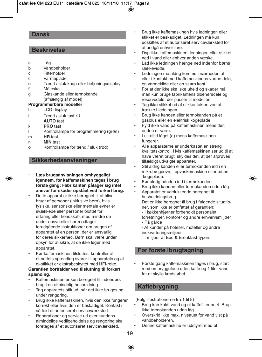 Le câble d’alimentation ne doit jamais être à proximité ou en contact avec les parties chaudes de votre appareil, près d’une source de chaleur ou sur un angle vif. Pour votre sécurité, n’utiliser que des accessoires et des pièces détachées du fabricant adaptés à votre appareil. Ne pas débrancher la fiche de la prise en tirant sur le câble. Ne pas utiliser la verseuse ou le pot isotherme sur une flamme et sur des plaques de cuisinières électriques. Ne pas remettre d’eau dans l’appareil s’il est encore chaud. Toujours fermer le couvercle (a) lors du fonctionnement de la cafetière. Tous les appareils sont soumis à un contrôle qualité sévère. Des essais d’utilisation pratiques sont faits avec des appareils pris au hasard ce qui explique d’éventuelles traces d’utilisation. Ne jamais mettre votre verseuse ou votre pot isotherme dans un four à micro-ondes, dans un lave-vaisselle ou sur une plaque de cuisson. Ne jamais introduire votre main à l’intérieur du pot isotherme. N’utilisez pas la verseuse ou le pot isotherme sans leur couvercle. Votre machine a été conçue pour un usage domestique seulement. Elle n’a pas été conçue pour être utilisée dans les cas suivants qui ne sont pas couverts par la garantie: - Dans des coins de cuisines réservés au personnel dans des magasins, bureaux et autres environnements professionnels, Dans des fermes, Par les clients des hôtels, motels et autres environnements à caractère résidentiel, Dans des environnements de type chambres d’hôtes.