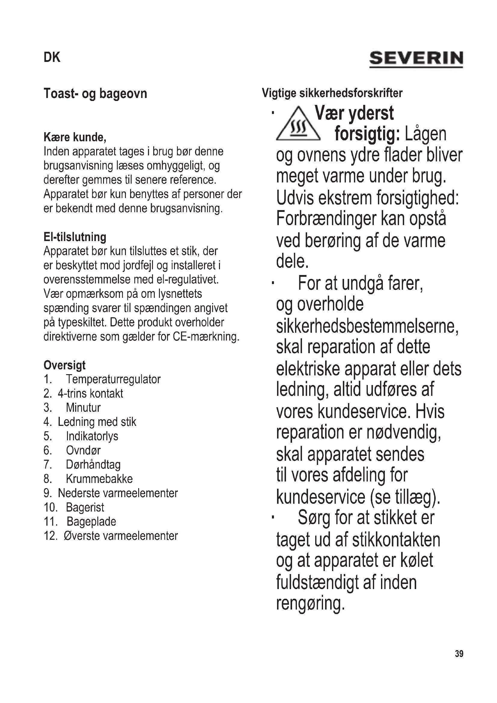 Toast- og bageovn Kære kunde, Inden apparatet tages i brug bør denne brugsanvisning læses omhyggeligt, og derefter gemmes til senere reference. Apparatet bør kun benyttes af personer der er bekendt med denne brugsanvisning. El-tilslutning Apparatet bør kun tilsluttes et stik, der er beskyttet mod jordfejl og installeret i overensstemmelse med el-regulativet. Vær opmærksom på om lysnettets spænding svarer til spændingen angivet på typeskiltet. Dette produkt overholder direktiverne som gælder for CE-mærkning. Oversigt