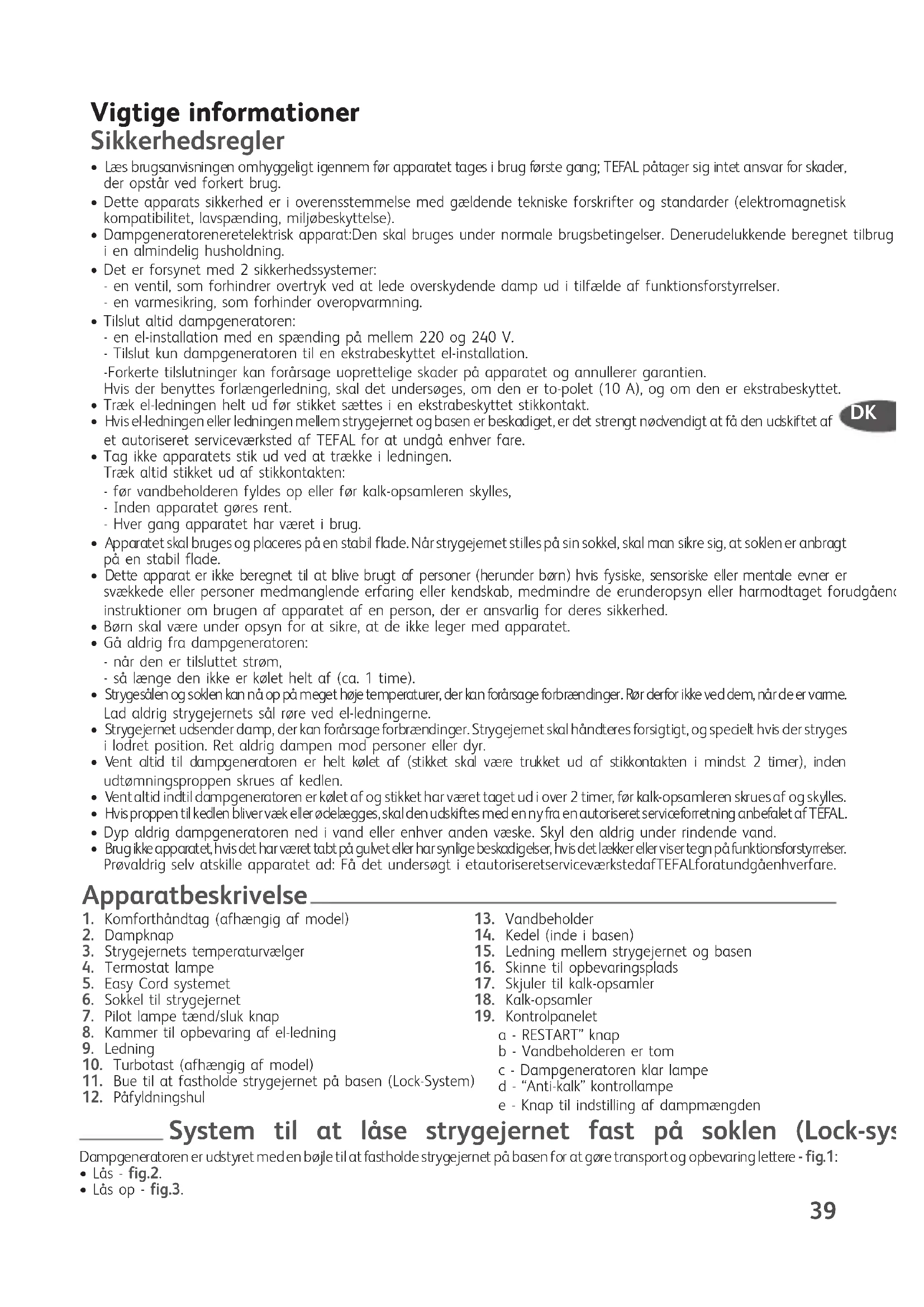 a - RESTART” knap b - Vandbeholderen er tom c - Dampgeneratoren klar lampe d - “Anti-kalk” kontrollampe e - Knap til indstilling af dampmængden Apparatbeskrivelse System til at låse strygejernet fast på soklen (Lock-system) Dampgeneratoren er udstyret meden bøjle tilat fastholdestrygejernet på basen for at gøre transportog opbevaring lettere - fig.1: