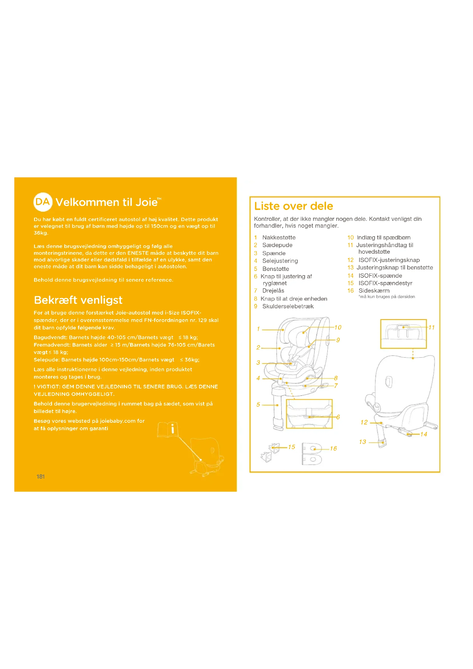 Du har købt en fuldt certificeret autostol af høj kvalitet. Dette produkt er velegnet til brug af børn med højde op til 150cm og en vægt op til 36kg.Læs denne brugsvejledning omhyggeligt og følg alle monteringstrinene﹐ da dette er den ENESTE måde at beskytte dit barn mod alvorlige skader eller dødsfald i tilfælde af en ulykke﹐ samt den eneste måde at dit barn kan sidde behageligt i autostolen.Behold denne brugsvejledning til senere reference. Bekræft venligst For at bruge denne forstærket Joie-autostol med i-Size ISOFIX-spænder﹐ der er i overensstemmelse med FN-forordningen nr. 129 skal dit barn opfylde følgende krav.Bagudvendt: Barnets højde 40-105 cm/Barnets vægt 18 kg; Fremadvendt: Barnets alder 15 m/Barnets højde 76-105 cm/Barets vægt 18 kg; Selepude: Barnets højde 100cm-150cm/Barnets vægt 36kg;Læs alle instruktionerne i denne vejledning﹐ inden produktet monteres og tages i brug.! VIGTIGT: GEM DENNE VEJLEDNING TIL SENERE BRUG. LÆS DENNE VEJLEDNING OMHYGGELIGT.Behold denne brugervejledning i rummet bag på sædet﹐ som vist på billedet til højre. Besøg vores websted på joiebaby.com for at få oplysninger om garanti Liste over dele 1 Nakkestøtte2 Sædepude3 Spænde4 Selejustering5 Benstøtte6 Knap til justering af ryglænet7 Drejelås8 Knap til at dreje enheden9 Skulderselebetræk10 Indlæg til spædbørn11 Justeringshåndtag til hovedstøtte12 ISOFIX-justeringsknap13 Justeringsknap til benstøtte14 ISOFIX-spænde15 ISOFIX-spændestyr16 Sideskærm*må kun bruges på dørsidenKontroller, at der ikke mangler nogen dele. Kontakt venligst din forhandler, hvis noget mangler.