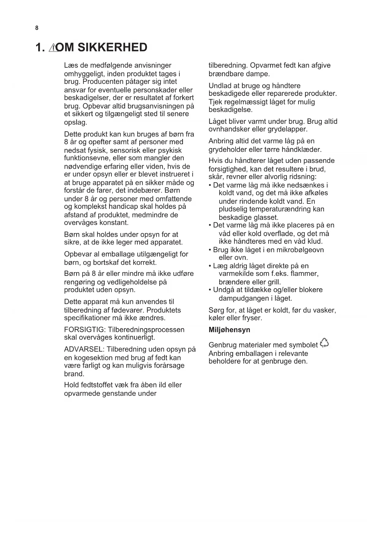 Læs de medfølgende anvisninger omhyggeligt, inden produktet tages i brug. Producenten påtager sig intet ansvar for eventuelle personskader eller beskadigelser, der er resultatet af forkert brug. Opbevar altid brugsanvisningen på et sikkert og tilgængeligt sted til senere opslag. Dette produkt kan kun bruges af børn fra 8 år og opefter samt af personer med nedsat fysisk, sensorisk eller psykisk funktionsevne, eller som mangler den nødvendige erfaring eller viden, hvis de er under opsyn eller er blevet instrueret i at bruge apparatet på en sikker måde og forstår de farer, det indebærer. Børn under 8 år og personer med omfattende og komplekst handicap skal holdes på afstand af produktet, medmindre de overvåges konstant. Børn skal holdes under opsyn for at sikre, at de ikke leger med apparatet. Opbevar al emballage utilgængeligt for børn, og bortskaf det korrekt. Børn på 8 år eller mindre må ikke udføre rengøring og vedligeholdelse på produktet uden opsyn. Dette apparat må kun anvendes til tilberedning af fødevarer. Produktets specifikationer må ikke ændres. FORSIGTIG: Tilberedningsprocessen skal overvåges kontinuerligt. ADVARSEL: Tilberedning uden opsyn på en kogesektion med brug af fedt kan være farligt og kan muligvis forårsage brand. Hold fedtstoffet væk fra åben ild eller opvarmede genstande under tilberedning. Opvarmet fedt kan afgive brændbare dampe. Undlad at bruge og håndtere beskadigede eller reparerede produkter. Tjek regelmæssigt låget for mulig beskadigelse. Låget bliver varmt under brug. Brug altid ovnhandsker eller grydelapper. Anbring altid det varme låg på en grydeholder eller tørre håndklæder. Hvis du håndterer låget uden passende forsigtighed, kan det resultere i brud, skår, revner eller alvorlig ridsning:
