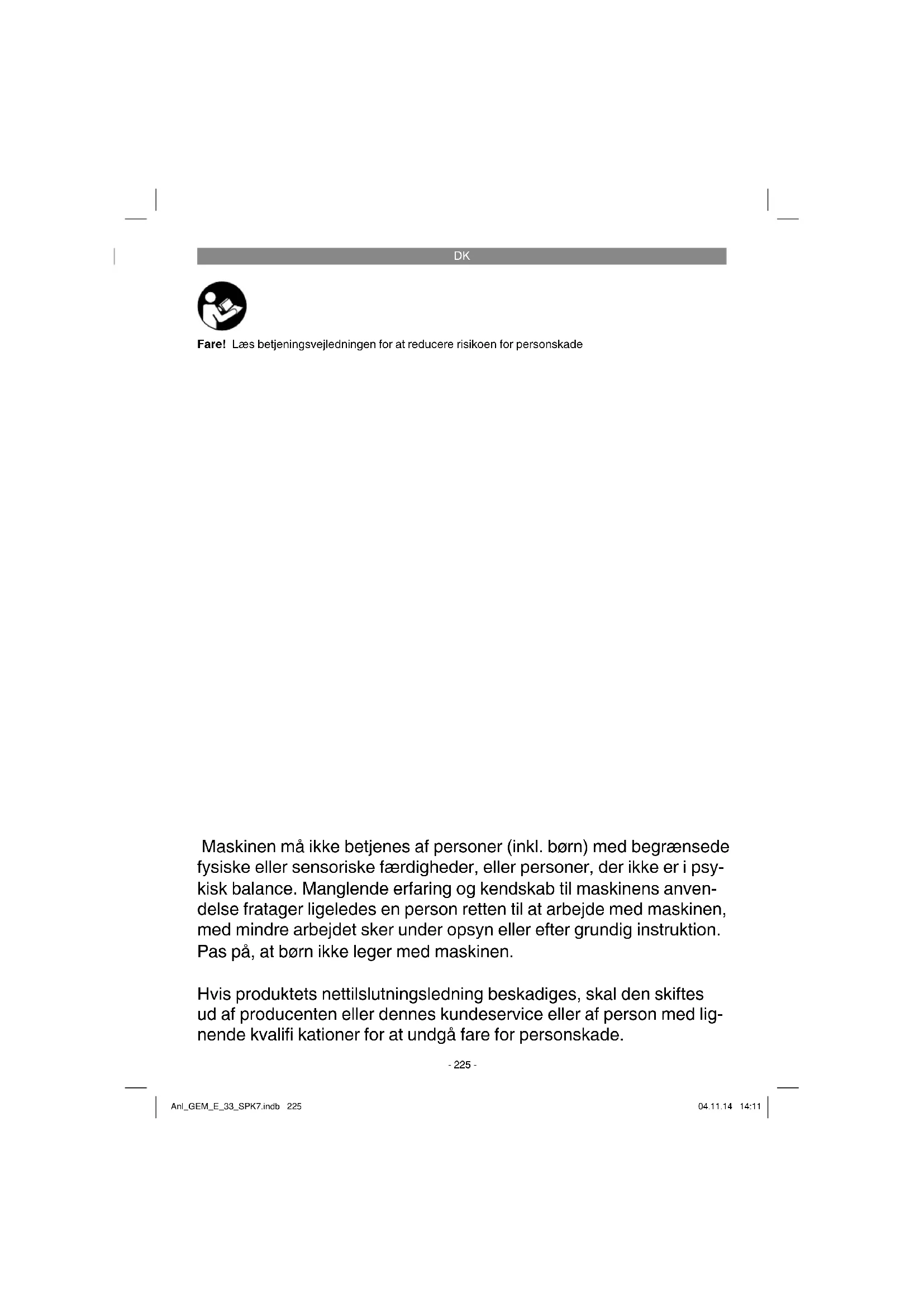 Fare! Læs betjeningsvejledningen for at reducere risikoen for personskade Maskinen må ikke betjenes af personer (inkl. børn) med begrænsede fysiske eller sensoriske færdigheder, eller personer, der ikke er i psy- kisk balance. Manglende erfaring og kendskab til maskinens anven- delse fratager ligeledes en person retten til at arbejde med maskinen, med mindre arbejdet sker under opsyn eller efter grundig instruktion. Pas på, at børn ikke leger med maskinen. Hvis produktets nettilslutningsledning beskadiges, skal den skiftes ud af producenten eller dennes kundeservice eller af person med lig- nende kvalifi kationer for at undgå fare for personskade. Anl_GEM_E_33_SPK7.indb 225Anl_GEM_E_33_SPK7.indb 225 04.11.14 14:1104.11.14 14:11DK