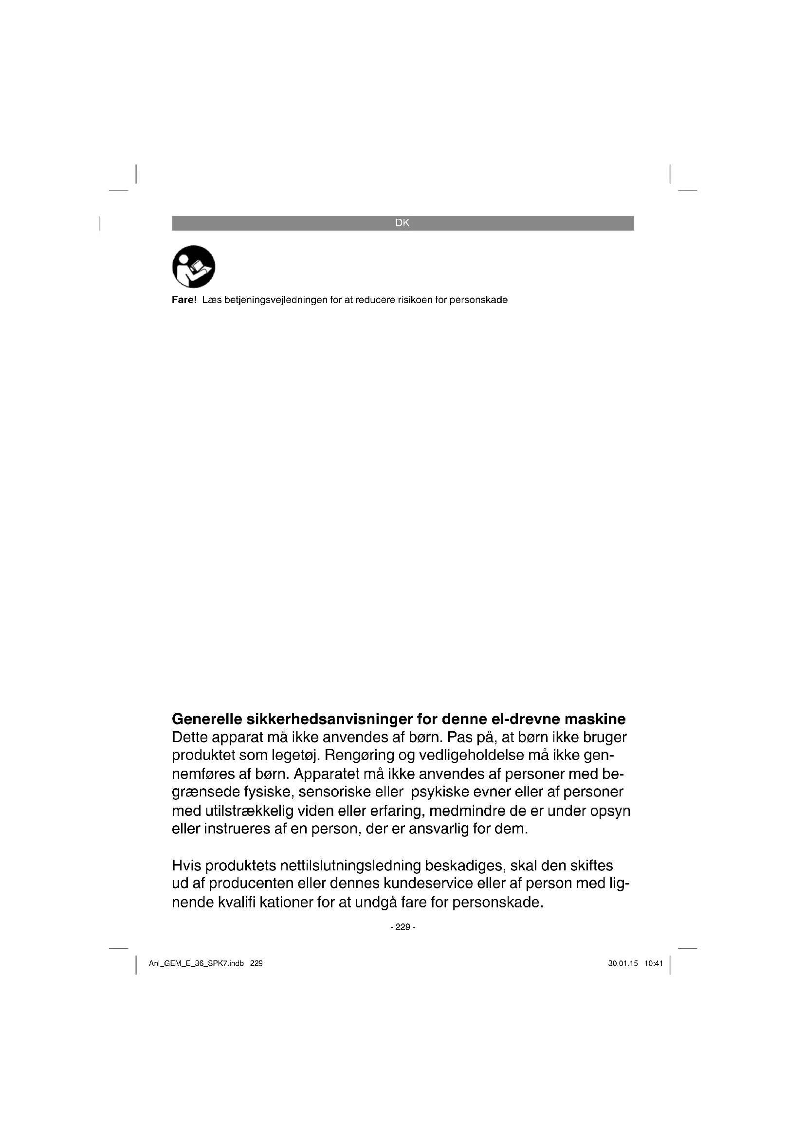 Fare! Læs betjeningsvejledningen for at reducere risikoen for personskade Generelle sikkerhedsanvisninger for denne el-drevne maskine Dette apparat må ikke anvendes af børn. Pas på, at børn ikke bruger produktet som legetøj. Rengøring og vedligeholdelse må ikke gen- nemføres af børn. Apparatet må ikke anvendes af personer med be- grænsede fysiske, sensoriske eller psykiske evner eller af personer med utilstrækkelig viden eller erfaring, medmindre de er under opsyn eller instrueres af en person, der er ansvarlig for dem. Hvis produktets nettilslutningsledning beskadiges, skal den skiftes ud af producenten eller dennes kundeservice eller af person med lig- nende kvalifi kationer for at undgå fare for personskade. Anl_GEM_E_36_SPK7.indb 229Anl_GEM_E_36_SPK7.indb 229 30.01.15 10:4130.01.15 10:41DK