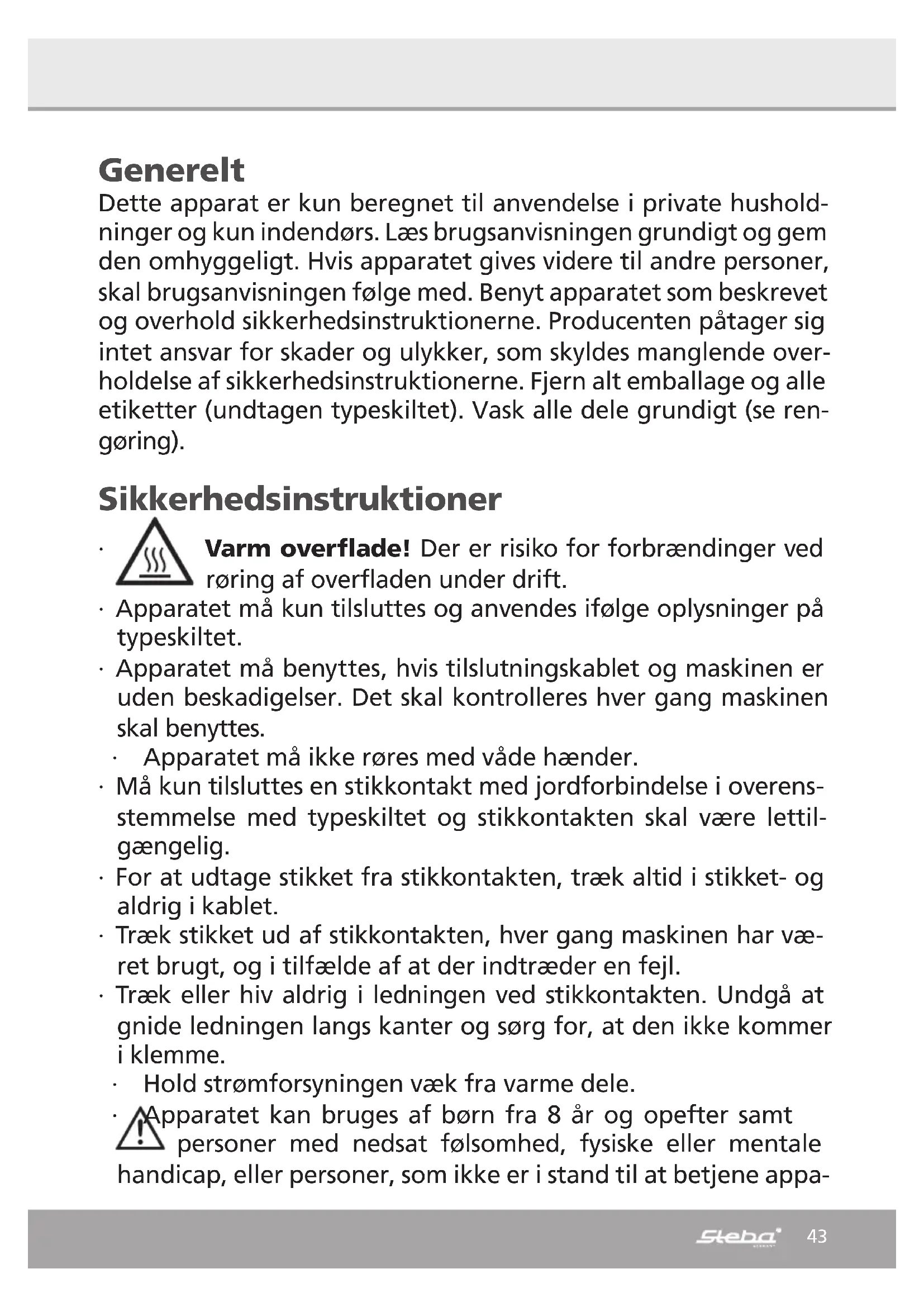 Generelt Dette apparat er kun beregnet til anvendelse i private hushold- ninger og kun indendørs. Læs brugsanvisningen grundigt og gem den omhyggeligt. Hvis apparatet gives videre til andre personer, skal brugsanvisningen følge med. Benyt apparatet som beskrevet og overhold sikkerhedsinstruktionerne. Producenten påtager sig intet ansvar for skader og ulykker, som skyldes manglende over- holdelse af sikkerhedsinstruktionerne. Fjern alt emballage og alle etiketter (undtagen typeskiltet). Vask alle dele grundigt (se ren- gøring). Sikkerhedsinstruktioner ∙ Varm overflade! Der er risiko for forbrændinger ved røring af overfladen under drift. ∙ Apparatet må kun tilsluttes og anvendes ifølge oplysninger på typeskiltet. ∙ Apparatet må benyttes, hvis tilslutningskablet og maskinen er uden beskadigelser. Det skal kontrolleres hver gang maskinen skal benyttes. ∙ Apparatet må ikke røres med våde hænder. ∙ Må kun tilsluttes en stikkontakt med jordforbindelse i overens- stemmelse med typeskiltet og stikkontakten skal være lettil- gængelig. ∙ For at udtage stikket fra stikkontakten, træk altid i stikket- og aldrig i kablet. ∙ Træk stikket ud af stikkontakten, hver gang maskinen har væ- ret brugt, og i tilfælde af at der indtræder en fejl. ∙ Træk eller hiv aldrig i ledningen ved stikkontakten. Undgå at gnide ledningen langs kanter og sørg for, at den ikke kommer i klemme. ∙ Hold strømforsyningen væk fra varme dele. ∙ Apparatet kan bruges af børn fra 8 år og opefter samt personer med nedsat følsomhed, fysiske eller mentale handicap, eller personer, som ikke er i stand til at betjene appa-44 ratet, medmindre de overvåges eller instrueres i brugen af ap- paratet og forstår de farer som er forbundet dermed. Lad al- drig børn lege med apparatet eller emballagen. Rengøring og vedligeholdelse af apparatet må ikke foretages af børn, med- mindre de er fyldt 8 år og overvåges af en voksen. ∙ Apparatet og ledningen skal opbevares utilgængeligt for børn under 8 år. ∙ Børn skal overvåges af en voksen for at sikre, at de ikke leger med apparatet eller emballagen (f.eks. plastposer). ∙ Apparatet må ikke betjenes med en timer eller et separat fjern- styringssystem! ∙ Apparatet må ikke anvendes uden opsyn. ∙ Opbevar ikke i det fri eller i et fugtigt rum.