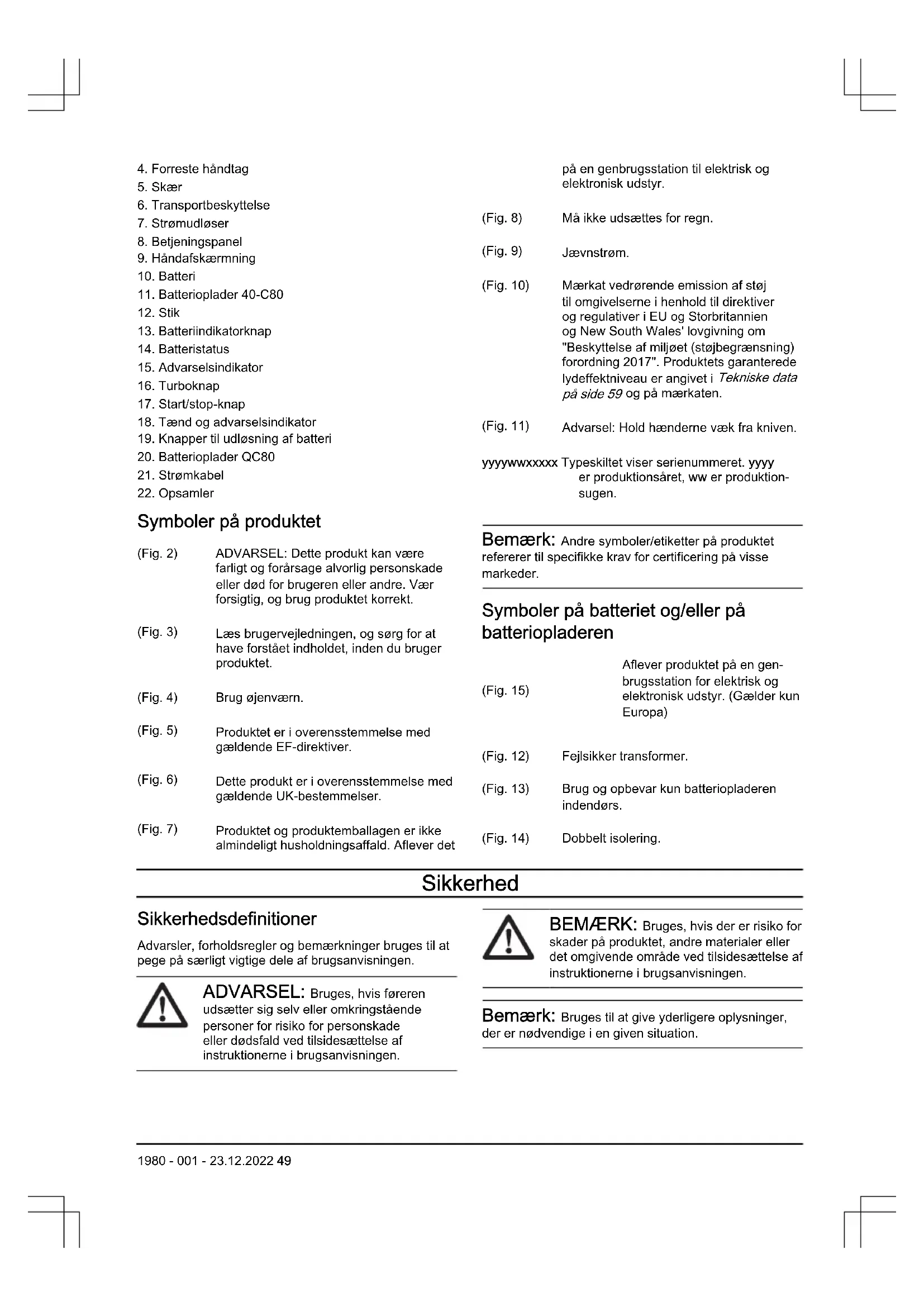 Symboler på produktet (Fig. 2) ADVARSEL: Dette produkt kan være farligt og forårsage alvorlig personskade eller død for brugeren eller andre. Vær forsigtig, og brug produktet korrekt. (Fig. 3) Læs brugervejledningen, og sørg for at have forstået indholdet, inden du bruger produktet. (Fig. 4) Brug øjenværn. (Fig. 5) Produktet er i overensstemmelse med gældende EF-direktiver. (Fig. 6) Dette produkt er i overensstemmelse med gældende UK-bestemmelser. (Fig. 7) Produktet og produktemballagen er ikke almindeligt husholdningsaffald. Aflever det på en genbrugsstation til elektrisk og elektronisk udstyr. (Fig. 8) Må ikke udsættes for regn. (Fig. 9) Jævnstrøm. (Fig. 10) Mærkat vedrørende emission af støj til omgivelserne i henhold til direktiver og regulativer i EU og Storbritannien og New South Wales' lovgivning om "Beskyttelse af miljøet (støjbegrænsning) forordning 2017". Produktets garanterede lydeffektniveau er angivet i Tekniske data på side 59 og på mærkaten. (Fig. 11) Advarsel: Hold hænderne væk fra kniven. yyyywwxxxxx Typeskiltet viser serienummeret. yyyy er produktionsåret, ww er produktion- sugen. Bemærk: Andre symboler/etiketter på produktet refererer til specifikke krav for certificering på visse markeder. Symboler på batteriet og/eller på batteriopladeren (Fig. 15) Aflever produktet på en gen- brugsstation for elektrisk og elektronisk udstyr. (Gælder kun Europa) (Fig. 12) Fejlsikker transformer. (Fig. 13) Brug og opbevar kun batteriopladeren indendørs. (Fig. 14) Dobbelt isolering. Sikkerhed Sikkerhedsdefinitioner Advarsler, forholdsregler og bemærkninger bruges til at pege på særligt vigtige dele af brugsanvisningen. ADVARSEL: Bruges, hvis føreren udsætter sig selv eller omkringstående personer for risiko for personskade eller dødsfald ved tilsidesættelse af instruktionerne i brugsanvisningen. BEMÆRK: Bruges, hvis der er risiko for skader på produktet, andre materialer eller det omgivende område ved tilsidesættelse af instruktionerne i brugsanvisningen. Bemærk: Bruges til at give yderligere oplysninger, der er nødvendige i en given situation. 1980 - 001 - 23.12.2022 49Generelle sikkerhedsadvarsler om elektrisk værktøj ADVARSEL: Læs alle sikkerhedsadvarsler og instruktioner. Hvis man ignorerer advarsler og anvisninger, kan det medføre elektrisk stød, brand og/eller alvorlig tilskadekomst. Bemærk: Opbevar alle advarsler og instruktioner til senere brug. Betegnelsen "elværktøj" i advarslerne henviser til dit værktøj, som drives af strøm fra elektricitetsnettet (med ledning) eller fra batteri (ledningsfrit). Sikkerhed i arbejdsområdet