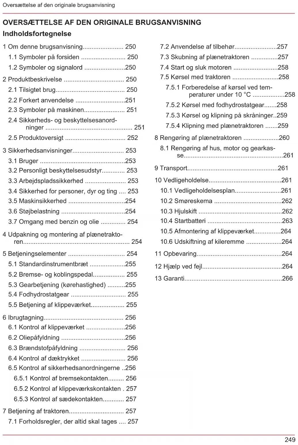 8 Rengøring af plænetraktoren ....................260