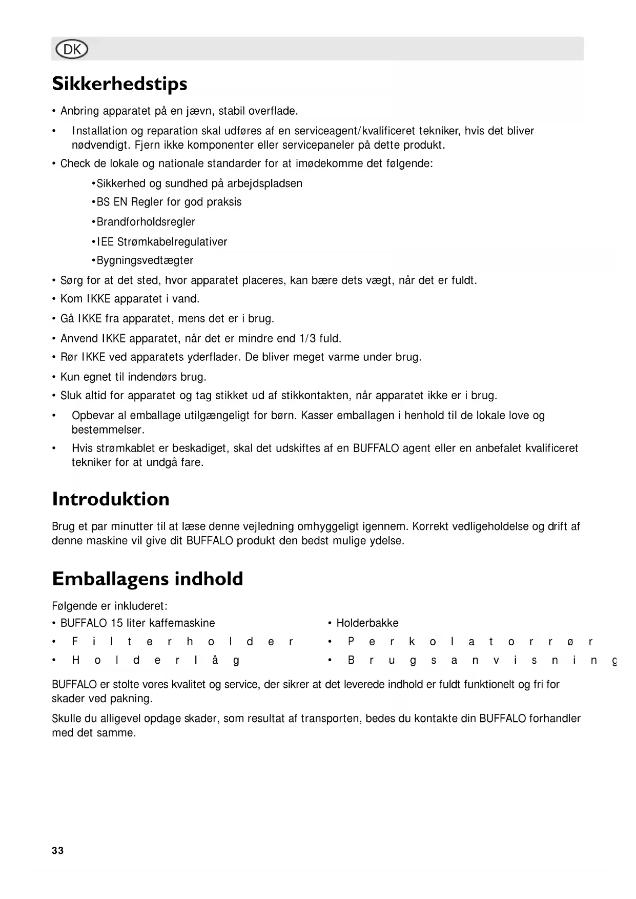 - Hvis strømkablet er beskadiget, skal det udskiftes af en BUFFALO agent eller en anbefalet kvalificeret tekniker for at undgå fare. Introduktion Brug et par minutter til at læse denne vejledning omhyggeligt igennem. Korrekt vedligeholdelse og drift af denne maskine vil give dit BUFFALO produkt den bedst mulige ydelse. Emballagens indhold Følgende er inkluderet: BUFFALO er stolte vores kvalitet og service, der sikrer at det leverede indhold er fuldt funktionelt og fri for skader ved pakning. Skulle du alligevel opdage skader, som resultat af transporten, bedes du kontakte din BUFFALO forhandler med det samme.