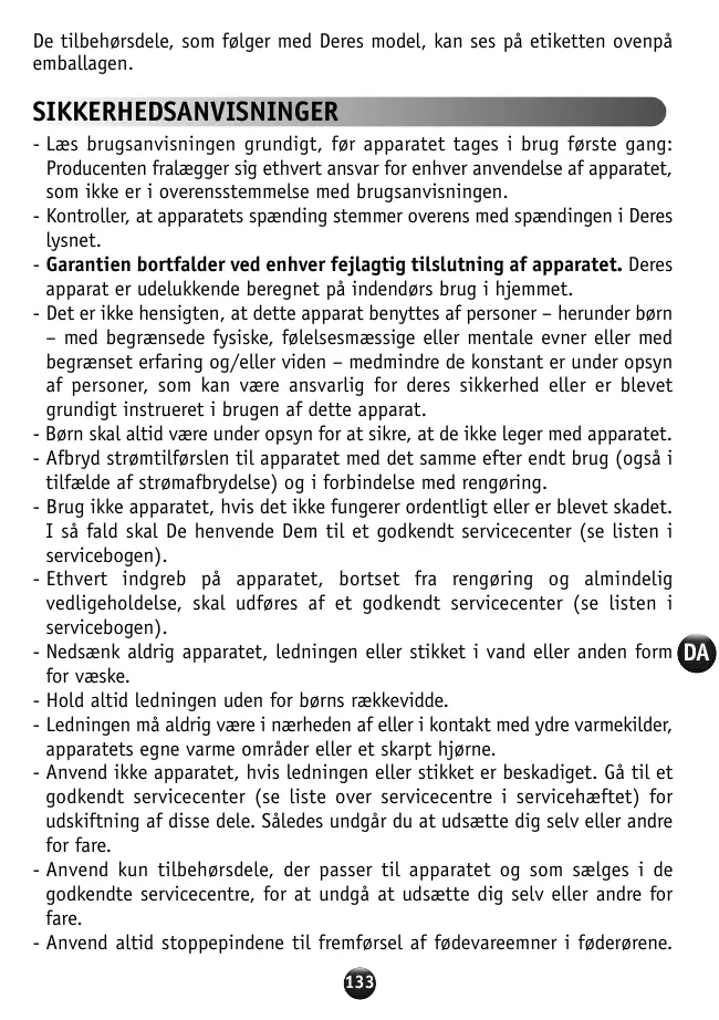 - Lisez attentivement le mode d’emploi avant la première utilisation de votre appareil : une utilisation non conforme au mode d’emploi dégagerait le fabricant de toute responsabilité. - Vérifiez que la tension d’alimentation de votre appareil correspond bien à celle de votre installation électrique. - Toute erreur de branchement annule la garantie. Votre appareil est destiné à un usage domestique à l’intérieur de la maison. - Cet appareil n'est pas prévu pour être utilisé par des personnes (y compris les enfants), dont les capacités physiques, sensorielles ou mentales sont réduites, ou des personnes dénuées d'expérience ou de connaissance, sauf si elles ont pu bénéficier, par l'intermédiaire d'une personne responsable de leur sécurité, d'une surveillance ou d'instructions préalables concernant l'utilisation de l'appareil. - Il convient de surveiller les enfants pour s’assurer qu’ils ne jouent pas avec l’appareil. - Débranchez votre appareil dès que vous cessez de l’utiliser (même en cas de coupure de courant) et lorsque vous le nettoyez. - N’utilisez pas votre appareil s’il ne fonctionne pas correctement ou s’il a été endommagé. Dans ce cas, adressez-vous à un centre agréé (voir liste dans le livret service). - Toute intervention autre que le nettoyage et l’entretien usuel par le client doit être effectuée par un centre agréé (voir liste dans le livret service). - Ne mettez pas l’appareil, le câble d’alimentation ou la fiche, dans l’eau ou tout autre liquide. - Ne laissez pas pendre le câble d’alimentation à portée de mains des enfants. - Le câble d’alimentation ne doit jamais être à proximité ou en contact avec les parties chaudes de votre appareil, près d’une source de chaleur ou sur un angle vif. - Si le câble d’alimentation ou la fiche sont endommagés, n’utilisez pas l’appareil. Afin d’éviter tout danger, faites-les obligatoirement remplacer par un centre agréé (voir liste dans le livret service). - Pour votre sécurité, n’utilisez que des accessoires et des pièces détachées adaptés à votre appareil, vendus en centre agréé. - Utilisez toujours les poussoirs pour guider les aliments dans les cheminées, 7