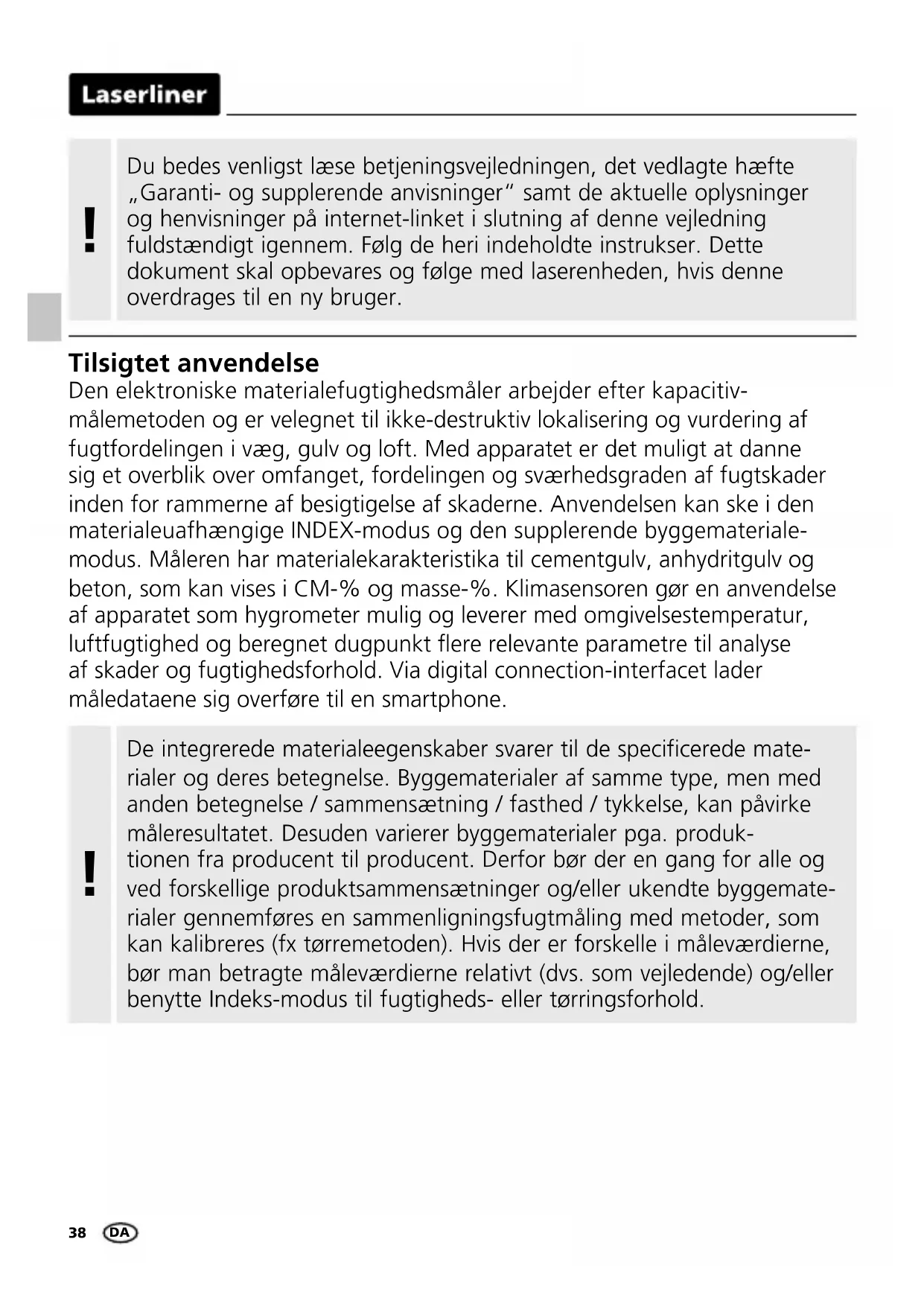 Du bedes venligst læse betjeningsvejledningen, det vedlagte hæfte „Garanti- og supplerende anvisninger“ samt de aktuelle oplysninger og henvisninger på internet-linket i slutning af denne vejledning fuldstændigt igennem. Følg de heri indeholdte instrukser. Dette dokument skal opbevares og følge med laserenheden, hvis denne overdrages til en ny bruger.
