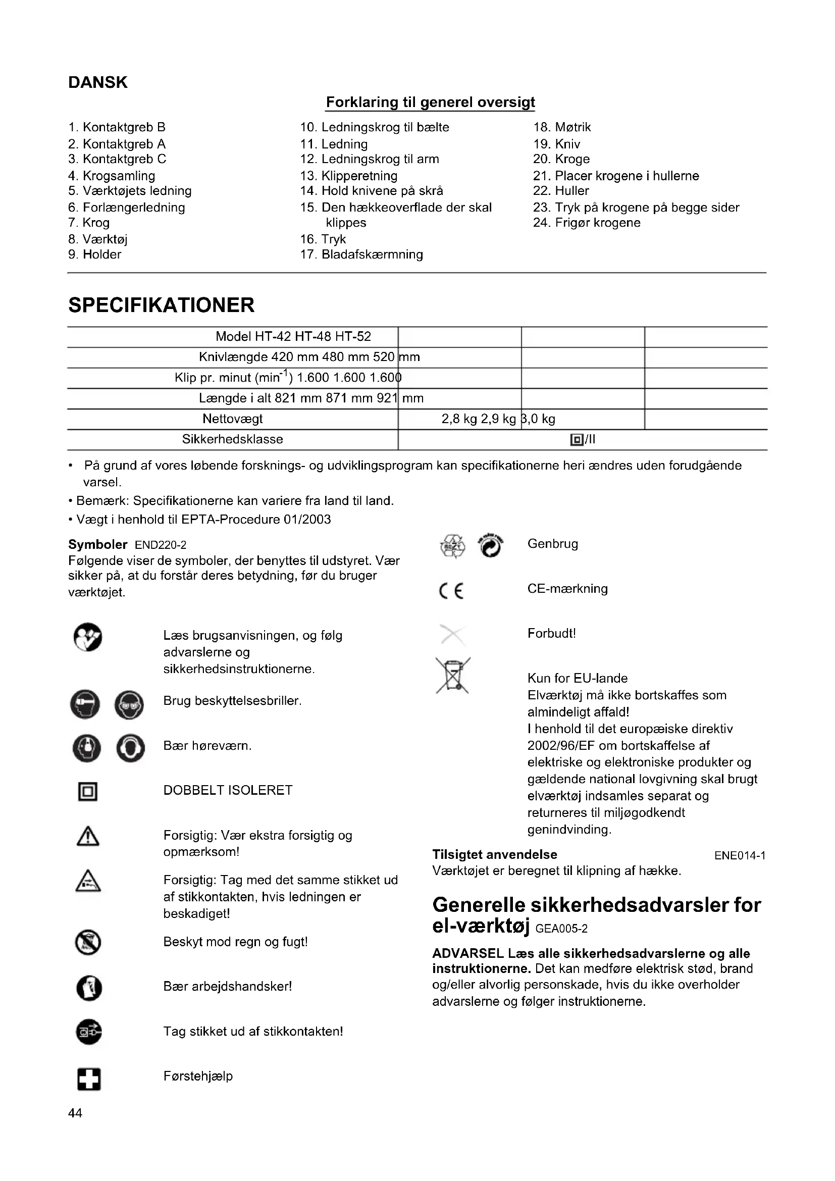 - Vægt i henhold til EPTA-Procedure 01/2003 Symboler END220-2 Følgende viser de symboler, der benyttes til udstyret. Vær sikker på, at du forstår deres betydning, før du bruger værktøjet. Læs brugsanvisningen, og følg advarslerne og sikkerhedsinstruktionerne. Brug beskyttelsesbriller. Bær høreværn. DOBBELT ISOLERET Forsigtig: Vær ekstra forsigtig og opmærksom! Forsigtig: Tag med det samme stikket ud af stikkontakten, hvis ledningen er beskadiget! Beskyt mod regn og fugt! Bær arbejdshandsker! Tag stikket ud af stikkontakten! Førstehjælp Genbrug CE-mærkning Forbudt! Kun for EU-lande Elværktøj må ikke bortskaffes som almindeligt affald! I henhold til det europæiske direktiv 2002/96/EF om bortskaffelse af elektriske og elektroniske produkter og gældende national lovgivning skal brugt elværktøj indsamles separat og returneres til miljøgodkendt genindvinding. Tilsigtet anvendelse ENE014-1 Værktøjet er beregnet til klipning af hække. Generelle sikkerhedsadvarsler for el-værktøj GEA005-2 ADVARSEL Læs alle sikkerhedsadvarslerne og alle instruktionerne. Det kan medføre elektrisk stød, brand og/eller alvorlig personskade, hvis du ikke overholder advarslerne og følger instruktionerne.