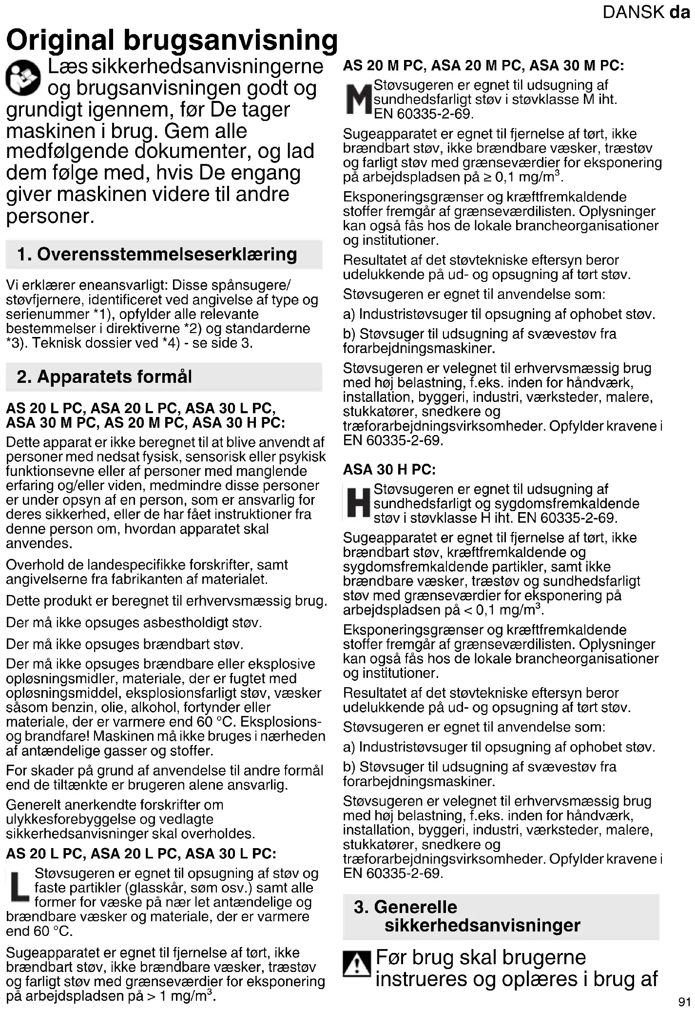 Original brugsanvisning Læs sikkerhedsanvisningerne og brugsanvisningen godt og grundigt igennem, før De tager maskinen i brug. Gem alle medfølgende dokumenter, og lad dem følge med, hvis De engang giver maskinen videre til andre personer. Vi erklærer eneansvarligt: Disse spånsugere/ støvfjernere, identificeret ved angivelse af type og serienummer *1), opfylder alle relevante bestemmelser i direktiverne *2) og standarderne *3). Teknisk dossier ved *4) - se side 3. AS 20 L PC, ASA 20 L PC, ASA 30 L PC, ASA 30 M PC, AS 20 M PC, ASA 30 H PC: Dette apparat er ikke beregnet til at blive anvendt af personer med nedsat fysisk, sensorisk eller psykisk funktionsevne eller af personer med manglende erfaring og/eller viden, medmindre disse personer er under opsyn af en person, som er ansvarlig for deres sikkerhed, eller de har fået instruktioner fra denne person om, hvordan apparatet skal anvendes. Overhold de landespecifikke forskrifter, samt angivelserne fra fabrikanten af materialet. Dette produkt er beregnet til erhvervsmæssig brug. Der må ikke opsuges asbestholdigt støv. Der må ikke opsuges brændbart støv. Der må ikke opsuges brændbare eller eksplosive opløsningsmidler, materiale, der er fugtet med opløsningsmiddel, eksplosionsfarligt støv, væsker såsom benzin, olie, alkohol, fortynder eller materiale, der er varmere end 60 °C. Eksplosions- og brandfare! Maskinen må ikke bruges i nærheden af antændelige gasser og stoffer. For skader på grund af anvendelse til andre formål end de tiltænkte er brugeren alene ansvarlig. Generelt anerkendte forskrifter om ulykkesforebyggelse og vedlagte sikkerhedsanvisninger skal overholdes. AS 20 L PC, ASA 20 L PC, ASA 30 L PC: Støvsugeren er egnet til opsugning af støv og faste partikler (glasskår, søm osv.) samt alle former for væske på nær let antændelige og brændbare væsker og materiale, der er varmere end 60 °C. Sugeapparatet er egnet til fjernelse af tørt, ikke brændbart støv, ikke brændbare væsker, træstøv og farligt støv med grænseværdier for eksponering på arbejdspladsen på > 1 mg/m³. AS 20 M PC, ASA 20 M PC, ASA 30 M PC: Støvsugeren er egnet til udsugning af sundhedsfarligt støv i støvklasse M iht. EN 60335-2-69. Sugeapparatet er egnet til fjernelse af tørt, ikke brændbart støv, ikke brændbare væsker, træstøv og farligt støv med grænseværdier for eksponering på arbejdspladsen på ≥ 0,1 mg/m³. Eksponeringsgrænser og kræftfremkaldende stoffer fremgår af grænseværdilisten. Oplysninger kan også fås hos de lokale brancheorganisationer og institutioner. Resultatet af det støvtekniske eftersyn beror udelukkende på ud- og opsugning af tørt støv. Støvsugeren er egnet til anvendelse som: a) Industristøvsuger til opsugning af ophobet støv. b) Støvsuger til udsugning af svævestøv fra forarbejdningsmaskiner. Støvsugeren er velegnet til erhvervsmæssig brug med høj belastning, f.eks. inden for håndværk, installation, byggeri, industri, værksteder, malere, stukkatører, snedkere og træforarbejdningsvirksomheder. Opfylder kravene i EN 60335-2-69. ASA 30 H PC: Støvsugeren er egnet til udsugning af sundhedsfarligt og sygdomsfremkaldende støv i støvklasse H iht. EN 60335-2-69. Sugeapparatet er egnet til fjernelse af tørt, ikke brændbart støv, kræftfremkaldende og sygdomsfremkaldende partikler, samt ikke brændbare væsker, træstøv og sundhedsfarligt støv med grænseværdier for eksponering på arbejdspladsen på < 0,1 mg/m³. Eksponeringsgrænser og kræftfremkaldende stoffer fremgår af grænseværdilisten. Oplysninger kan også fås hos de lokale brancheorganisationer og institutioner. Resultatet af det støvtekniske eftersyn beror udelukkende på ud- og opsugning af tørt støv. Støvsugeren er egnet til anvendelse som: a) Industristøvsuger til opsugning af ophobet støv. b) Støvsuger til udsugning af svævestøv fra forarbejdningsmaskiner. Støvsugeren er velegnet til erhvervsmæssig brug med høj belastning, f.eks. inden for håndværk, installation, byggeri, industri, værksteder, malere, stukkatører, snedkere og træforarbejdningsvirksomheder. Opfylder kravene i EN 60335-2-69. Før brug skal brugerne instrueres og oplæres i brug af