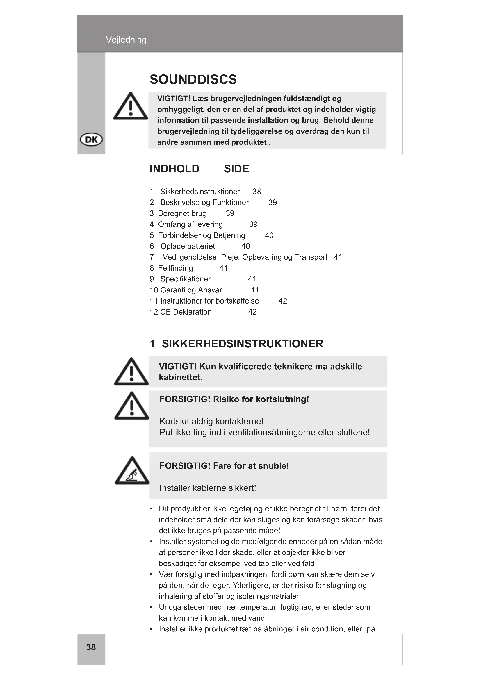 , ett registrerat varumärkeförWentronicGmbH,attenhetenuppfyllerdegrundläg- gandekravenochriktlinjernaenligtEuropeiskabestämmelser. Dessakanläsasonlineunderwww.cabstone.com.3738 Vejledning VIGTIGT! Læs brugervejledningen fuldstændigt og omhyggeligt. den er en del af produktet og indeholder vigtig information til passende installation og brug. Behold denne brugervejledning til tydeliggørelse og overdrag den kun til andre sammen med produktet . SOUNDDISCS INDHOLD SIDE 1 Sikkerhedsinstruktioner 38 2 BeskrivelseogFunktioner 39 3 Beregnet brug 39 4Omfangaflevering 39 5ForbindelserogBetjening 40 6 Opladebatteriet 40 7 Vedligeholdelse,Pleje,OpbevaringogTransport 41 8Fejlnding 41 9 Specikationer 41 10GarantiogAnsvar 41 11Instruktionerforbortskaffelse 42 12CEDeklaration 42 1 SIKKERHEDSINSTRUKTIONER VIGTIGT! Kun kvalicerede teknikere må adskille kabinettet.
