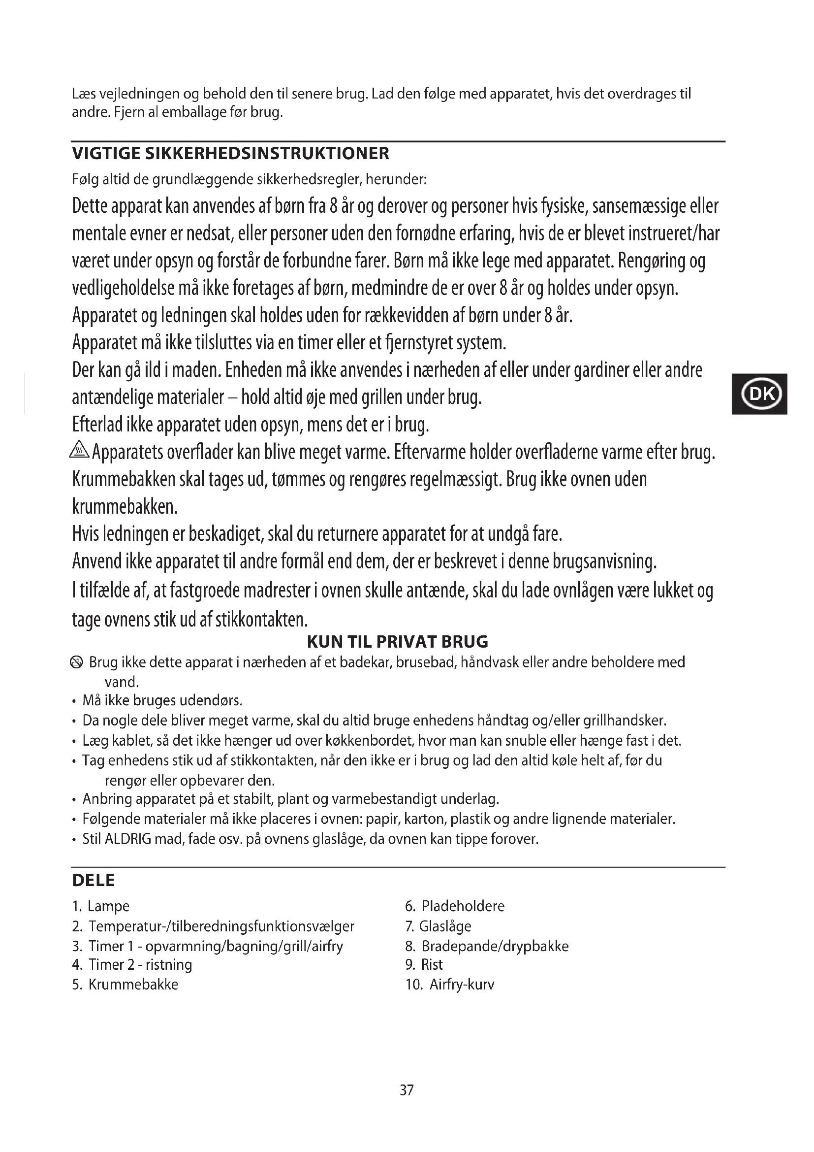 Apparatets overader kan blive meget varme. Eftervarme holder overaderne varme efter brug. Krummebakken skal tages ud, tømmes og rengøres regelmæssigt. Brug ikke ovnen uden krummebakken. Hvis ledningen er beskadiget, skal du returnere apparatet for at undgå fare. Anvend ikke apparatet til andre formål end dem, der er beskrevet i denne brugsanvisning. I tilfælde af, at fastgroede madrester i ovnen skulle antænde, skal du lade ovnlågen være lukket og tage ovnens stik ud af stikkontakten.