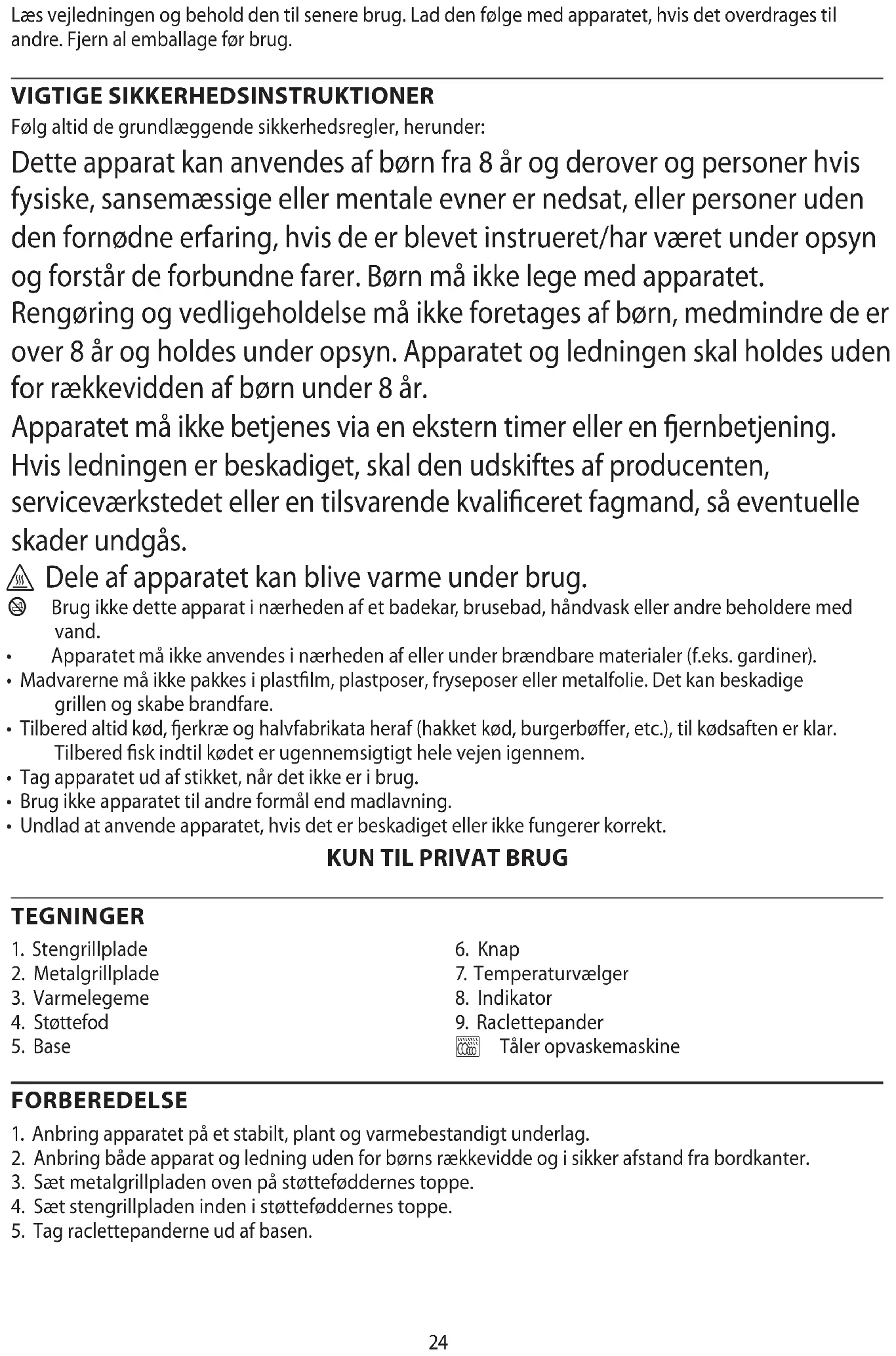 AE24 Læs vejledningen og behold den til senere brug. Lad den følge med apparatet, hvis det overdrages til andre. Fjern al emballage før brug. VIGTIGE SIKKERHEDSINSTRUKTIONER Følg altid de grundlæggende sikkerhedsregler, herunder: Dette apparat kan anvendes af børn fra 8 år og derover og personer hvis fysiske, sansemæssige eller mentale evner er nedsat, eller personer uden den fornødne erfaring, hvis de er blevet instrueret/har været under opsyn og forstår de forbundne farer. Børn må ikke lege med apparatet. Rengøring og vedligeholdelse må ikke foretages af børn, medmindre de er over 8 år og holdes under opsyn. Apparatet og ledningen skal holdes uden for rækkevidden af børn under 8 år. Apparatet må ikke betjenes via en ekstern timer eller en ernbetjening. Hvis ledningen er beskadiget, skal den udskiftes af producenten, serviceværkstedet eller en tilsvarende kvalificeret fagmand, så eventuelle skader undgås.