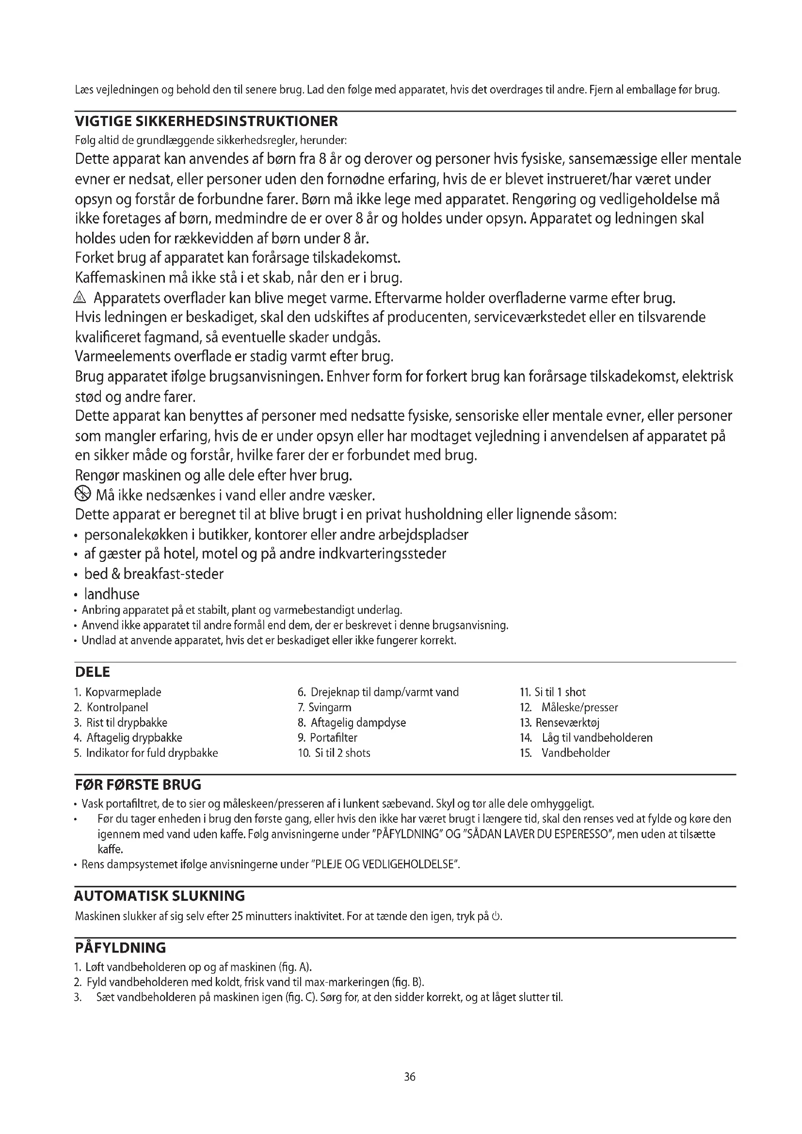 AE36 Læs vejledningen og behold den til senere brug. Lad den følge med apparatet, hvis det overdrages til andre. Fjern al emballage før brug. VIGTIGE SIKKERHEDSINSTRUKTIONER Følg altid de grundlæggende sikkerhedsregler, herunder: Dette apparat kan anvendes af børn fra 8 år og derover og personer hvis fysiske, sansemæssige eller mentale evner er nedsat, eller personer uden den fornødne erfaring, hvis de er blevet instrueret/har været under opsyn og forstår de forbundne farer. Børn må ikke lege med apparatet. Rengøring og vedligeholdelse må ikke foretages af børn, medmindre de er over 8 år og holdes under opsyn. Apparatet og ledningen skal holdes uden for rækkevidden af børn under 8 år. Forket brug af apparatet kan forårsage tilskadekomst. Kaffemaskinen må ikke stå i et skab, når den er i brug. h Apparatets overflader kan blive meget varme. Eftervarme holder overfladerne varme efter brug. Hvis ledningen er beskadiget, skal den udskiftes af producenten, serviceværkstedet eller en tilsvarende kvalificeret fagmand, så eventuelle skader undgås. Varmeelements overflade er stadig varmt efter brug. Brug apparatet ifølge brugsanvisningen. Enhver form for forkert brug kan forårsage tilskadekomst, elektrisk stød og andre farer. Dette apparat kan benyttes af personer med nedsatte fysiske, sensoriske eller mentale evner, eller personer som mangler erfaring, hvis de er under opsyn eller har modtaget vejledning i anvendelsen af apparatet på en sikker måde og forstår, hvilke farer der er forbundet med brug. Rengør maskinen og alle dele efter hver brug.