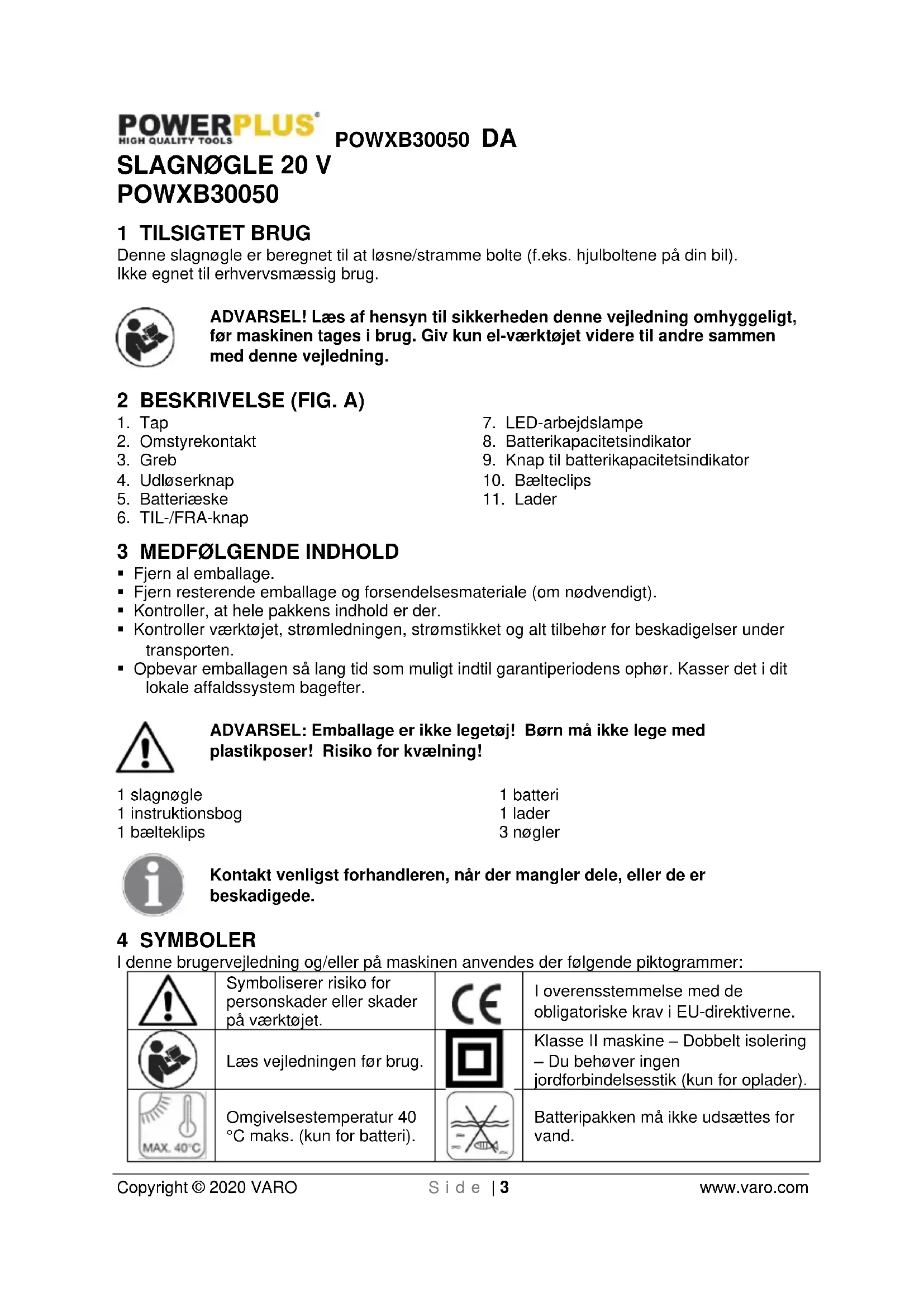 Batteripakken må ikke udsættes for vand.POWXB30050 DA Copyright © 2020 VARO S i d e | 4 www.varo.com