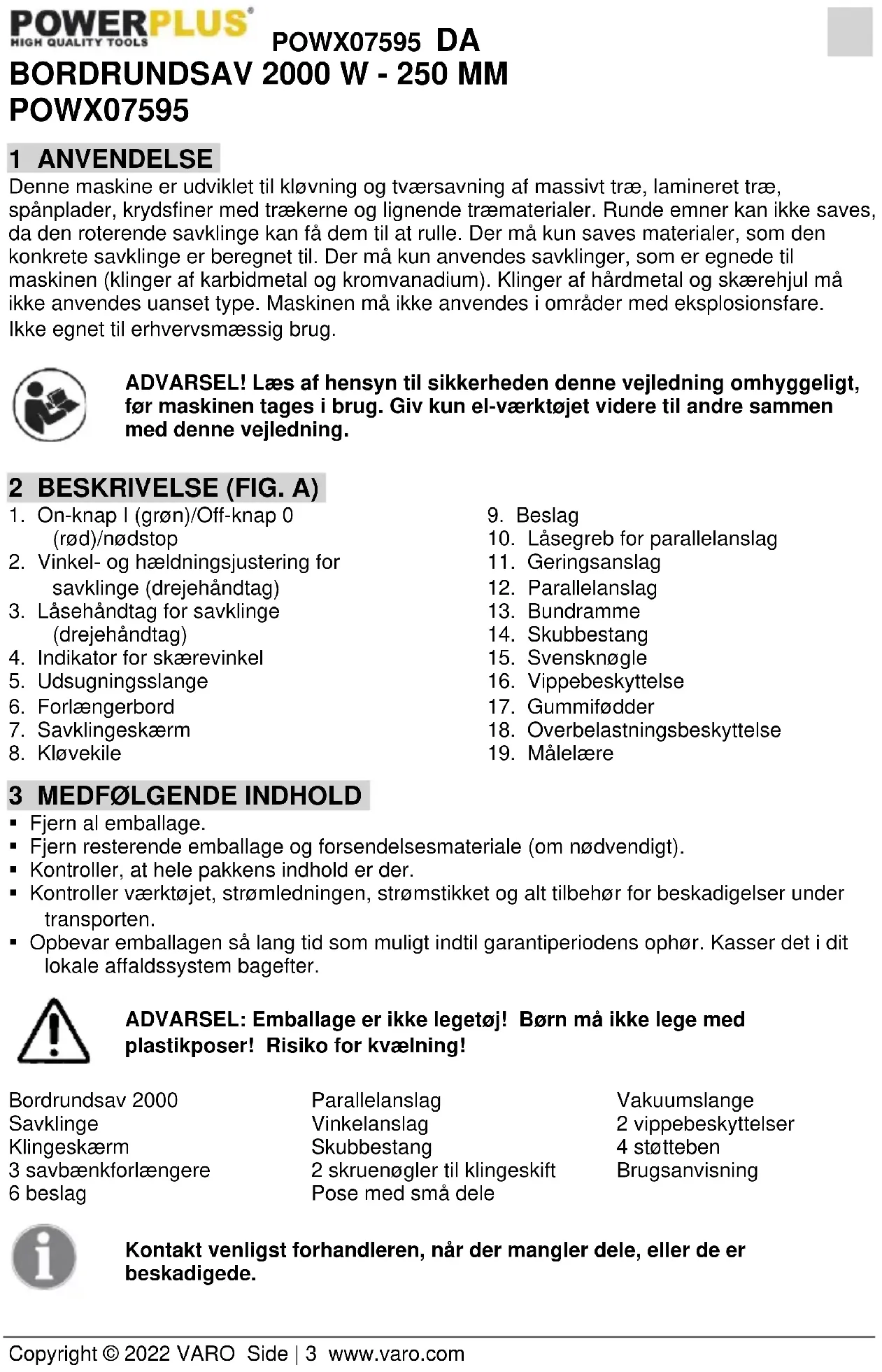 - Opbevar emballagen så lang tid som muligt indtil garantiperiodens ophør. Kasser det i dit lokale affaldssystem bagefter. ADVARSEL: Emballage er ikke legetøj! Børn må ikke lege med plastikposer! Risiko for kvælning! Bordrundsav 2000 Savklinge Klingeskærm 3 savbænkforlængere 6 beslag Parallelanslag Vinkelanslag Skubbestang 2 skruenøgler til klingeskift Pose med små dele Vakuumslange 2 vippebeskyttelser 4 støtteben Brugsanvisning Kontakt venligst forhandleren, når der mangler dele, eller de er beskadigede.POWX07595 DA Copyright © 2022 VARO Side | 4 www.varo.com 4 YDERLIGERE SIKKERHEDSANVISNINGER