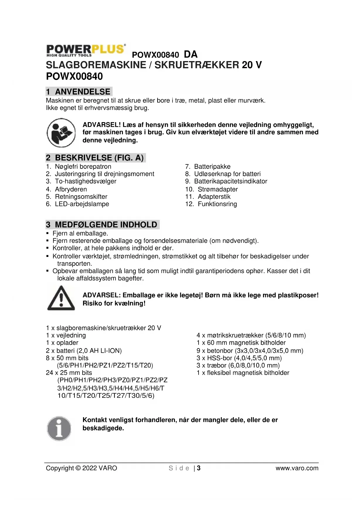 - Værktøjet må kun repareres af kvalificeret fagpersonale og med originale reservedele. Dette sikrer, at værktøjets sikkerhed bevares.POWX00840 DA Copyright © 2022 VARO S i d e | 6 www.varo.com 6 SUPPLERENDE SIKKERHEDSFORSKRIFTER