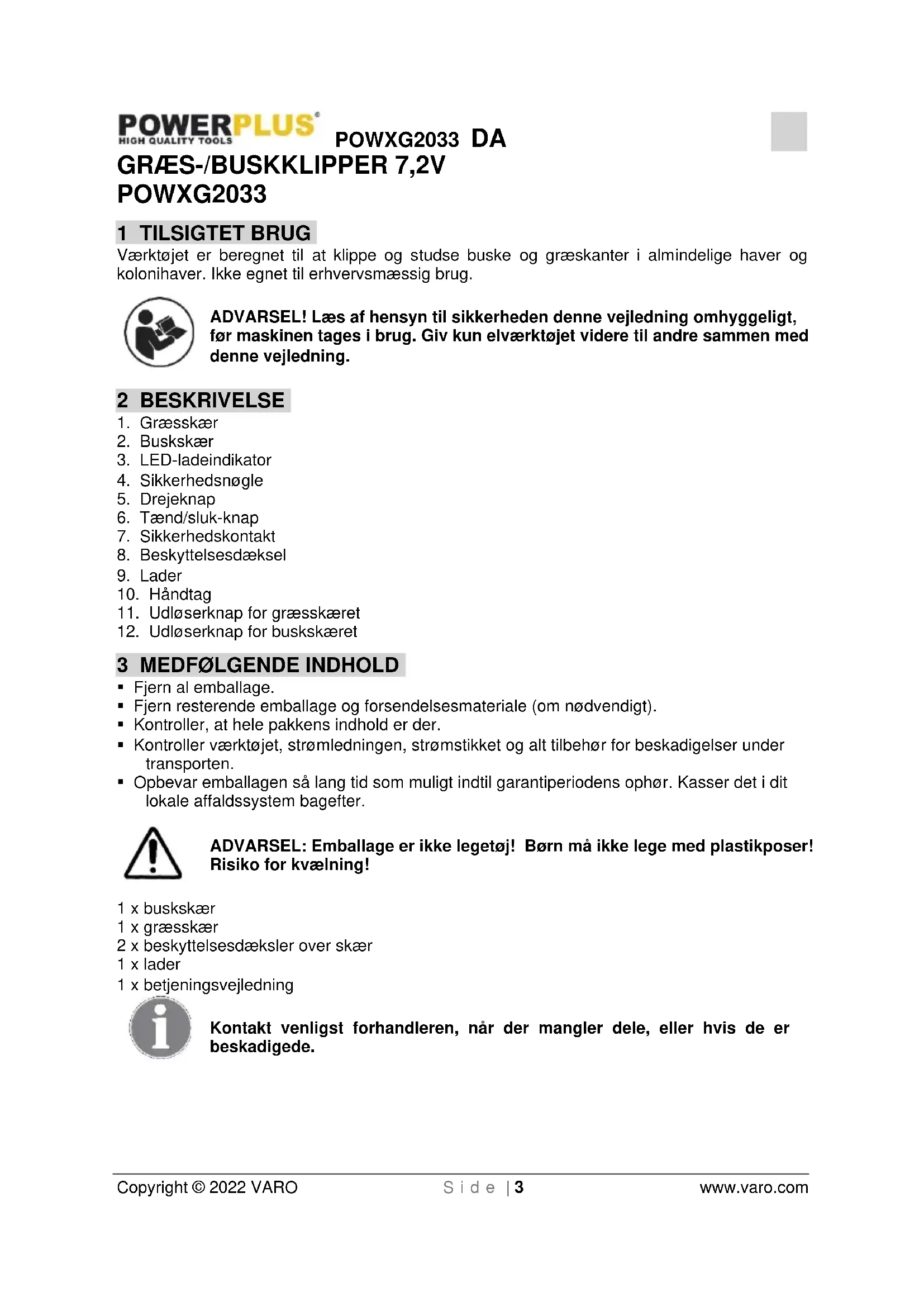 - Opbevar emballagen så lang tid som muligt indtil garantiperiodens ophør. Kasser det i dit lokale affaldssystem bagefter. ADVARSEL: Emballage er ikke legetøj! Børn må ikke lege med plastikposer! Risiko for kvælning! 1 x buskskær 1 x græsskær 2 x beskyttelsesdæksler over skær 1 x lader 1 x betjeningsvejledning Kontakt venligst forhandleren, når der mangler dele, eller hvis de er beskadigede.POWXG2033 DA Copyright © 2022 VARO S i d e | 4 www.varo.com 4 SYMBOLER I denne brugervejledning og/eller på maskinen anvendes der følgende piktogrammer:
