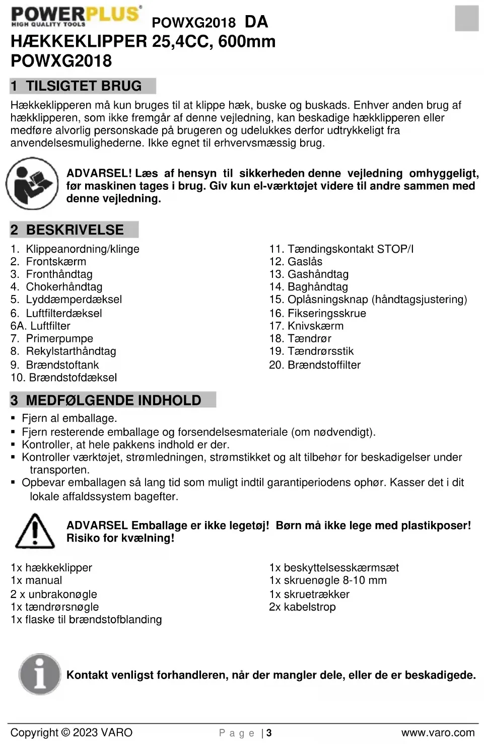 - Hold afstand. Hækkeklipperen udsender udstødningsgasser. Sørg for at tilskuerne holder en sikker afstand.POWXG2018 DA Copyright © 2023 VARO S i d e | 6 www.varo.com