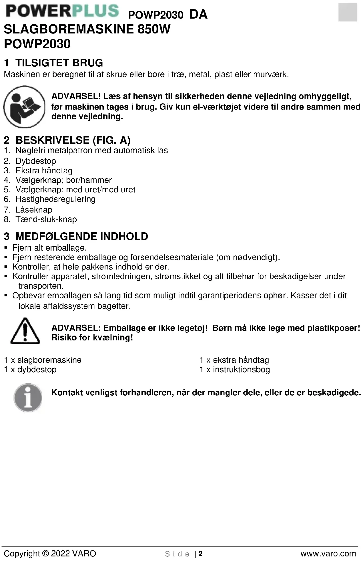 Copyright © 2022 VARO S i d e | 2 www.varo.com SLAGBOREMASKINE 850W POWP2030 1 TILSIGTET BRUG Maskinen er beregnet til at skrue eller bore i træ, metal, plast eller murværk. ADVARSEL! Læs af hensyn til sikkerheden denne vejledning omhyggeligt, før maskinen tages i brug. Giv kun el-værktøjet videre til andre sammen med denne vejledning. 2 BESKRIVELSE (FIG. A)