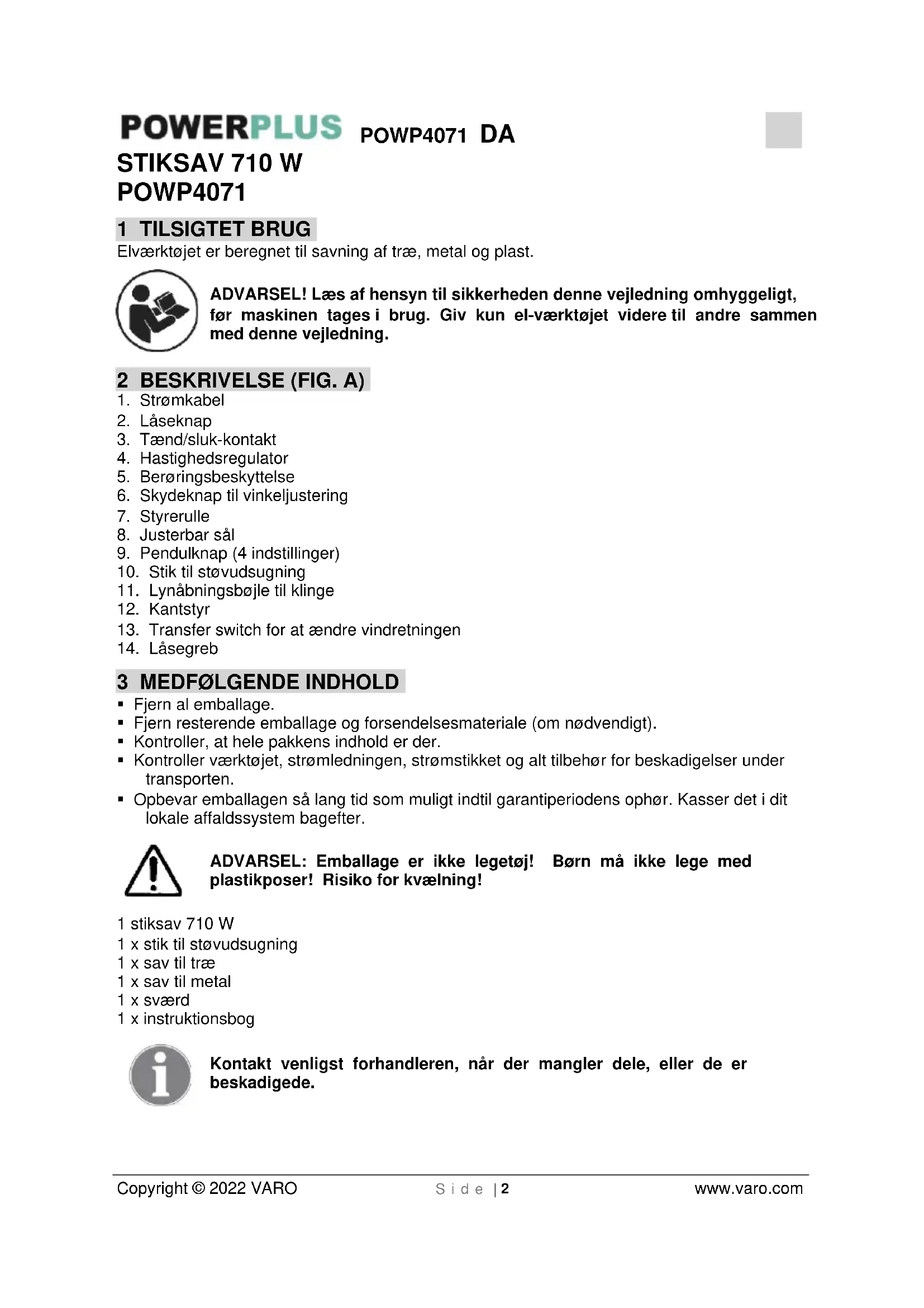 Copyright © 2022 VARO S i d e | 2 www.varo.com STIKSAV 710 W POWP4071 1 TILSIGTET BRUG Elværktøjet er beregnet til savning af træ, metal og plast. ADVARSEL! Læs af hensyn til sikkerheden denne vejledning omhyggeligt, før maskinen tages i brug. Giv kun el-værktøjet videre til andre sammen med denne vejledning. 2 BESKRIVELSE (FIG. A)