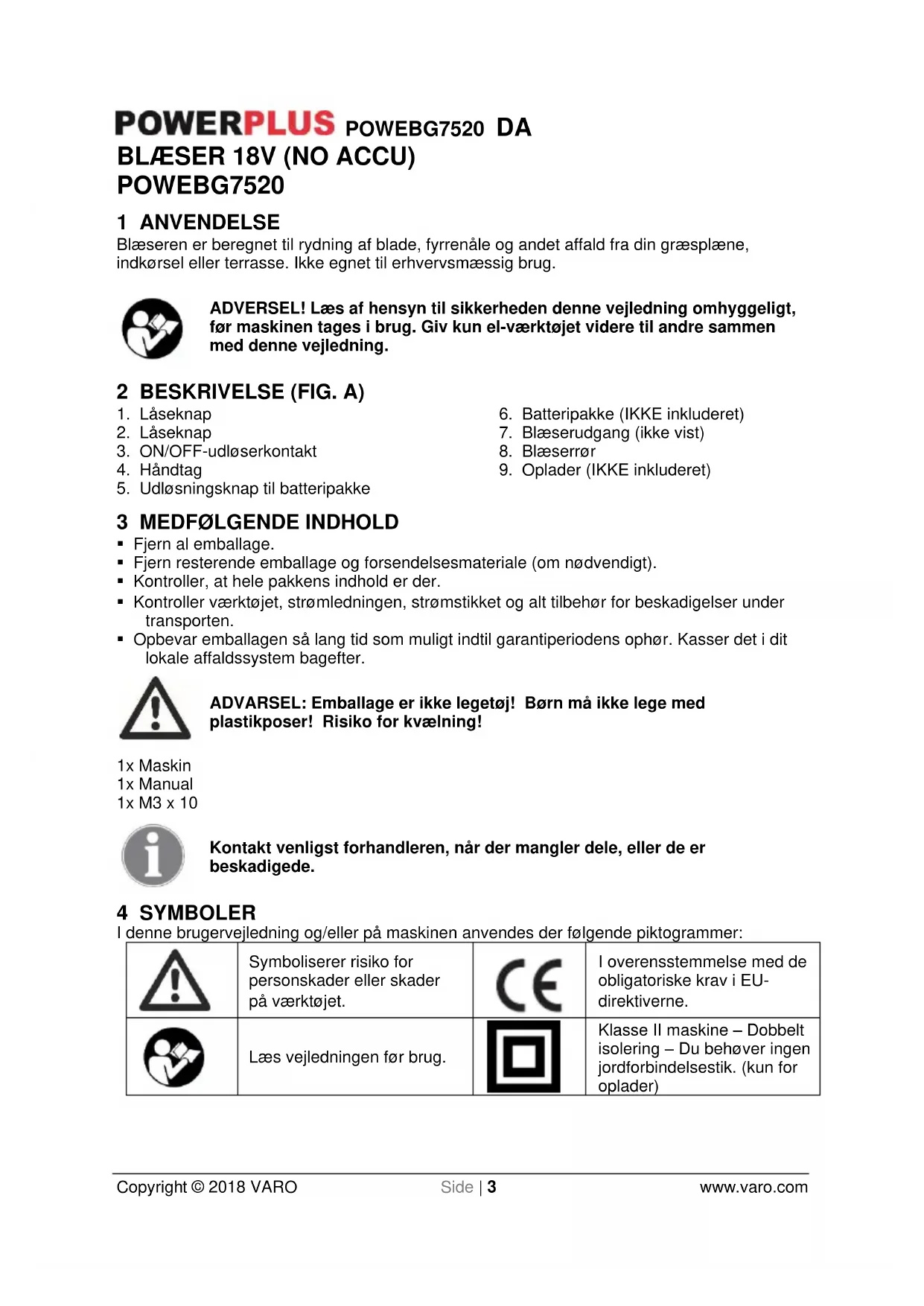 - Defekte ledninger skal udskiftes øjeblikkeligt.POWEBG7520 DA Copyright © 2018 VARO Side | 7 www.varo.com