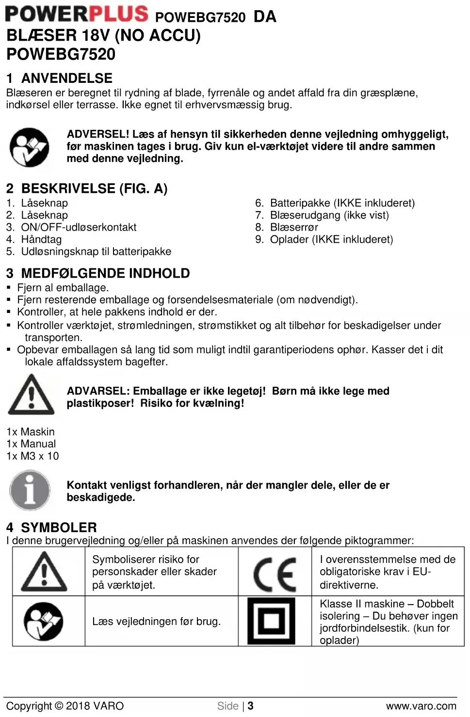 - Defekte ledninger skal udskiftes øjeblikkeligt.POWEBG7520 DA Copyright © 2018 VARO Side | 7 www.varo.com