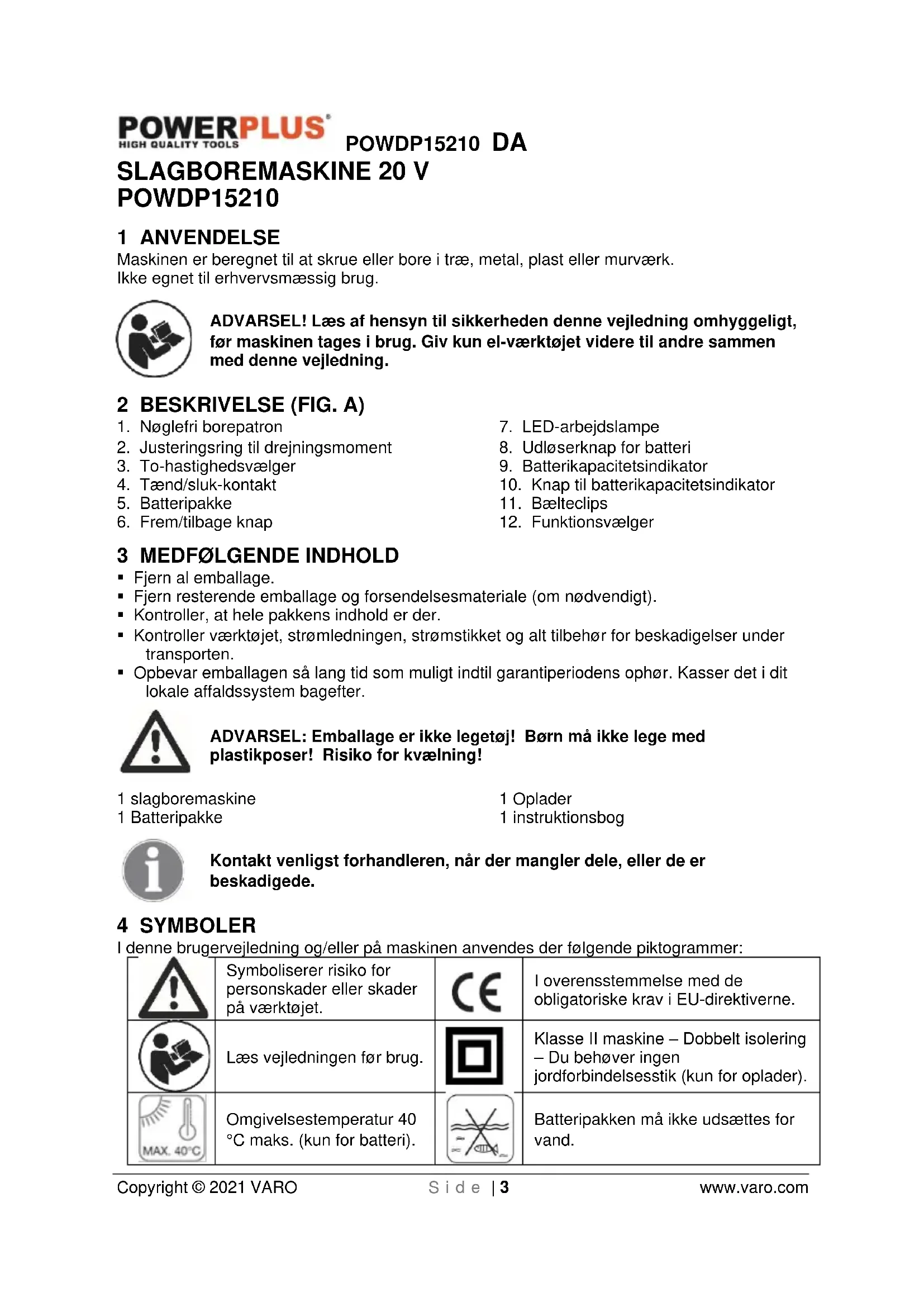 Batteripakken må ikke udsættes for vand.POWDP15210 DA Copyright © 2021 VARO S i d e | 4 www.varo.com