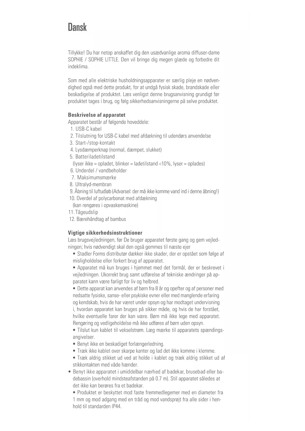 - I tilfælde af en reparation skal der tages højde for følgende, før apparatet sendes afsted eller afleveres hos forhandleren: Tøm alt vandet ud af ap- paratet (vandbakken resp. vandbeholderen) og lad apparatet tørre fuld- stændig ud. Hvis der er vandrester i apparatet under transporten, bliver apparatet beskadiget. I det tilfælde bortfalder garantien. Bortskaffelse EU-direktiv 2012 / 19 / CE om WEEE kræver, at brugte elektriske hushold- ningsapparater ikke bortskaffes sammen med almindeligt affald. Brugte apparater skal indsamles separat for optimal genbrug og genanvendelse af apparatets elementer og reduktion af miljøpåvirkning og helbredsrisici. Symbolet med skraldespanden med et kryds over på produktet er en påmin- delse til dig om din forpligtelse til at bortskaffe apparatet separat. Du bør kontakte de lokale myndigheder eller forhandleren for at få oplysninger om korrekt bortskafning af brugte apparater. Bortskaffelse af batteriet: Dette apparat indeholder et batteri, der ikke kan udskiftes. Når batteri- ets levetid er omme, skal apparatet bortskaffes korrekt. Må ikke lægges til husholdningsaffaldet, elektroden er emballeret i isole- ringspapir, der kan recycles og genbruges.Specifikationer Sophie Mærkespænding DC 5 V Mærkeeffekt 10 W Driftstid Op til 11 timers batteridrift, op til 16 timer med strømforsyning Mål 180 x 302 mm (diameter x højde) Vægt 1.1 kg Tankindhold 100 ml Støjniveau < 26 dB(A) Temperaturområde for batteriopladning 0–45 °C, Luftfugtighed ≤85 % RH Batterimodel YC-1P18650 -5200 mAh + YC-1P18650 -2600 mAh I overensstemmelse med EU godkendelse CE / WEEE / RoHS / EAC / UKCA Specifikationer Sophie little Mærkespænding DC 5 V Mærkeeffekt 10 W Driftstid Op til 7 timers batteridrift, op til 16 timer med strømforsyning Mål 133 x 212 mm (diameter x højde) Vægt 580 g Tankindhold 50 ml Støjniveau < 26 dB(A) Temperaturområde for batteriopladning 0–45 °C, Luftfugtighed ≤85 % RH Batterimodel YC-2P18650 -5200 mAh I overensstemmelse med EU godkendelse CE / WEEE / RoHS / EAC / UKCA Der tages forbehold for tekniske ændringerOnnittelut! Olet juuri hankkinut tavallisesta poikkeavan tuoksua levittävän SOPHIE / SOPHIE LITTLE-neidon. Se tulee tuottamaan sinulle paljon iloa ja huoneilmasi parantuu. Kuten kaikissa sähkökäyttöisissä kotitalouslaitteissa myös tämän laitteen käytössä vaaditaan erityistä tarkkaavaisuutta, jotta vältettäisiin loukkaan- tumiset, palo- ja laitevauriot. Tutustu tähän käyttöohjeeseen ennen laitteen käyttöönottoa ja noudata laitteella olevia turvallisuusohjeita. Laitekuvaus Laite koostuu seuraavista komponenteista: