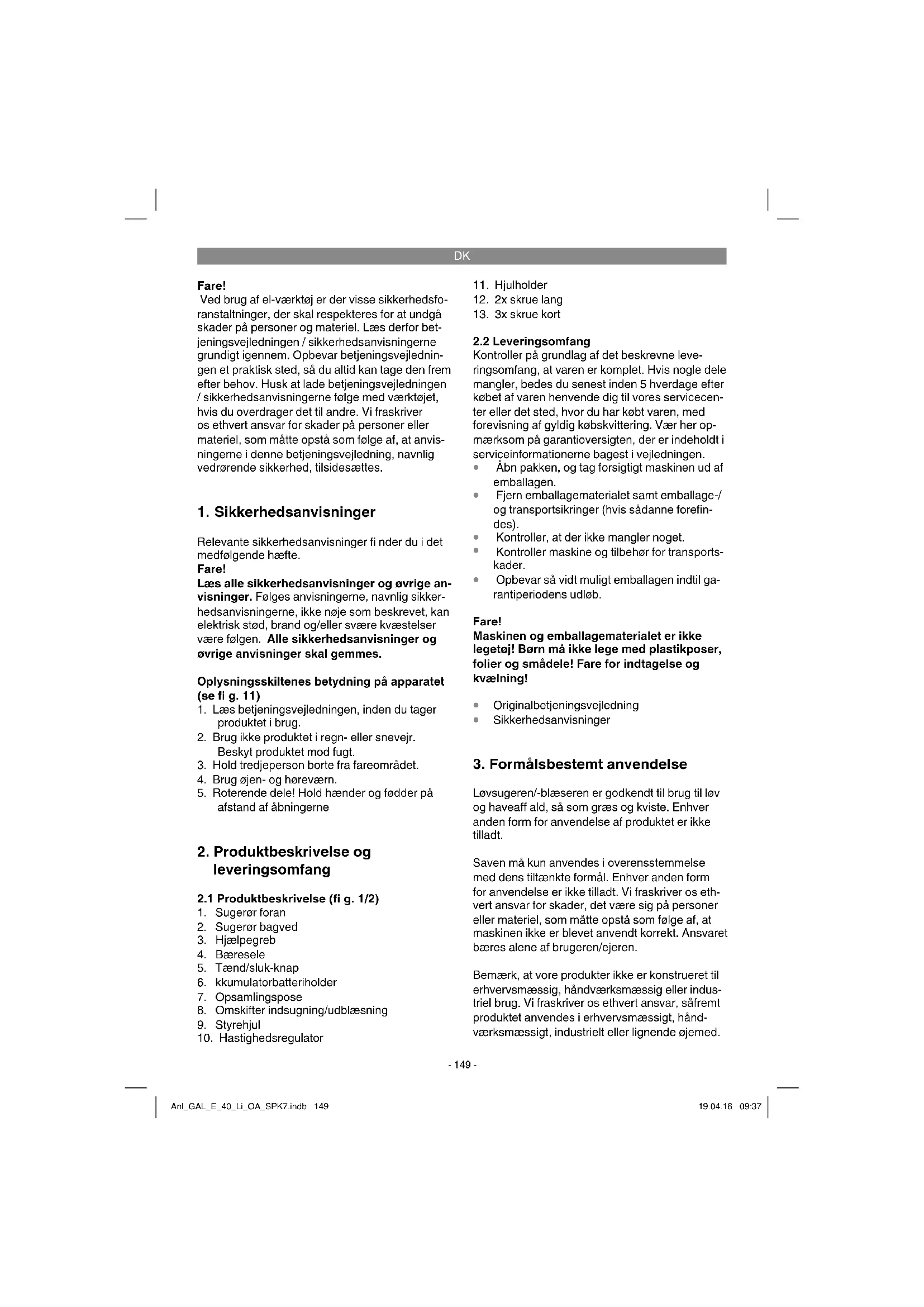 Løvsugeren/-blæseren er godkendt til brug til løv og haveaff ald, så som græs og kviste. Enhver anden form for anvendelse af produktet er ikke tilladt. Saven må kun anvendes i overensstemmelse med dens tiltænkte formål. Enhver anden form for anvendelse er ikke tilladt. Vi fraskriver os eth- vert ansvar for skader, det være sig på personer eller materiel, som måtte opstå som følge af, at maskinen ikke er blevet anvendt korrekt. Ansvaret bæres alene af brugeren/ejeren. Bemærk, at vore produkter ikke er konstrueret til erhvervsmæssig, håndværksmæssig eller indus- triel brug. Vi fraskriver os ethvert ansvar, såfremt produktet anvendes i erhvervsmæssigt, hånd- værksmæssigt, industrielt eller lignende øjemed. Anl_GAL_E_40_Li_OA_SPK7.indb 149Anl_GAL_E_40_Li_OA_SPK7.indb 149 19.04.16 09:3719.04.16 09:37DK
