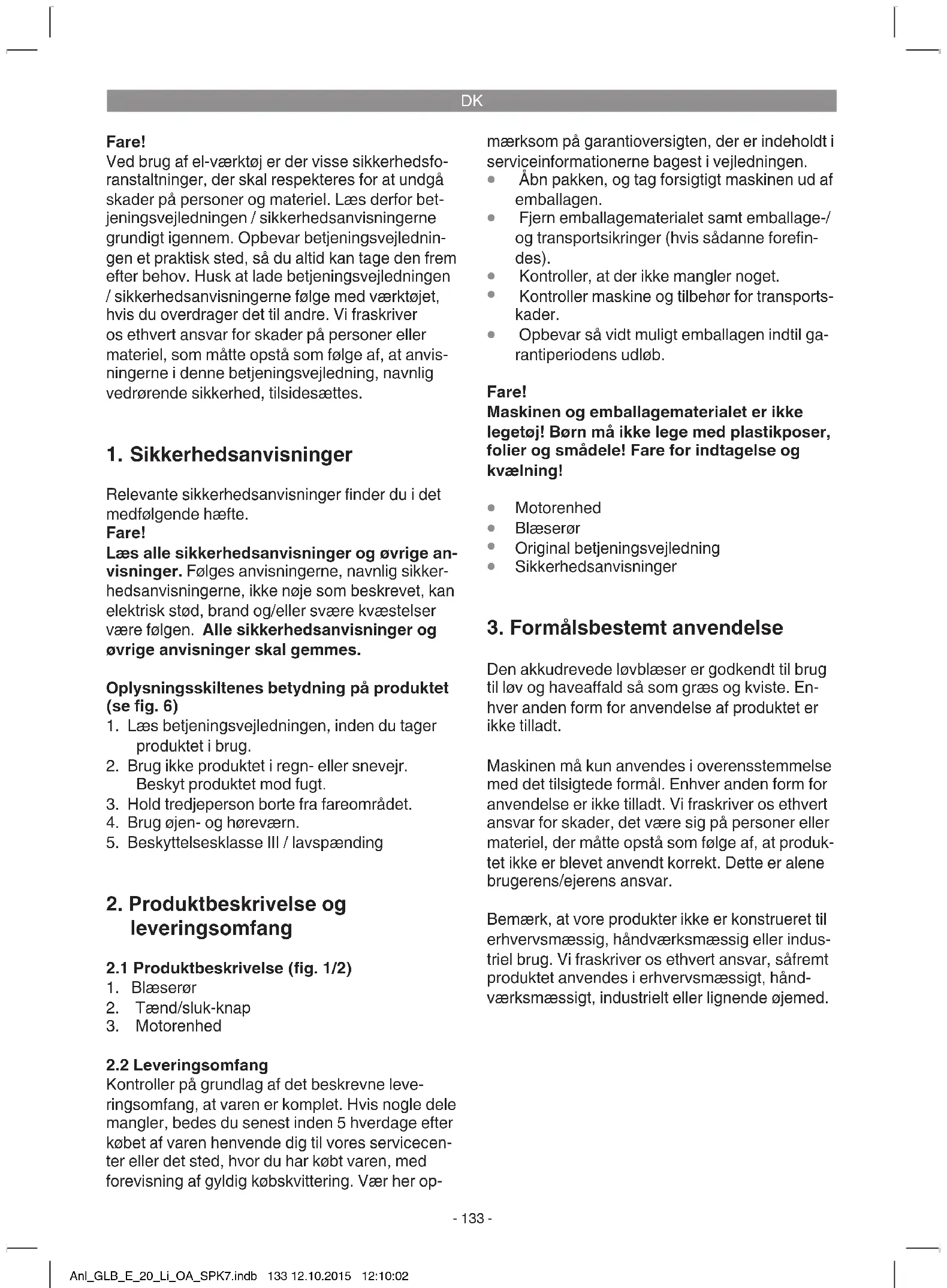 Den akkudrevede løvblæser er godkendt til brug til løv og haveaald så som græs og kviste. En- hver anden form for anvendelse af produktet er ikke tilladt. Maskinen må kun anvendes i overensstemmelse med det tilsigtede formål. Enhver anden form for anvendelse er ikke tilladt. Vi fraskriver os ethvert ansvar for skader, det være sig på personer eller materiel, der måtte opstå som følge af, at produk- tet ikke er blevet anvendt korrekt. Dette er alene brugerens/ejerens ansvar. Bemærk, at vore produkter ikke er konstrueret til erhvervsmæssig, håndværksmæssig eller indus- triel brug. Vi fraskriver os ethvert ansvar, såfremt produktet anvendes i erhvervsmæssigt, hånd- værksmæssigt, industrielt eller lignende øjemed. Anl_GLB_E_20_Li_OA_SPK7.indb 133 12.10.2015 12:10:02DK