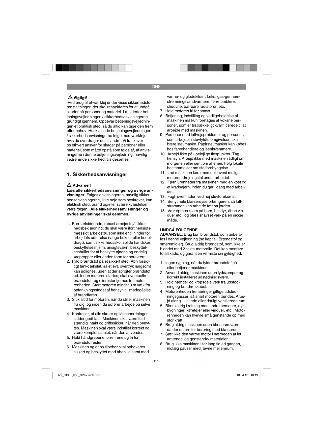 Løvsugeren/-blæseren er godkendt til brug til løv og haveaff ald, såsom græs og små kviste. Enhver anden form for anvendelse af maskinen er ikke tilladt. Saven må kun anvendes i overensstemmelse med dens tiltænkte formål. Enhver anden form for anvendelse er ikke tilladt. Vi fraskriver os eth- vert ansvar for skader, det være sig på personer eller materiel, som måtte opstå som følge af, at maskinen ikke er blevet anvendt korrekt. Ansvaret bæres alene af brugeren/ejeren. Anl_GBLE_650_SPK7.indb 68Anl_GBLE_650_SPK7.indb 68 18.04.13 10:1918.04.13 10:19DNK