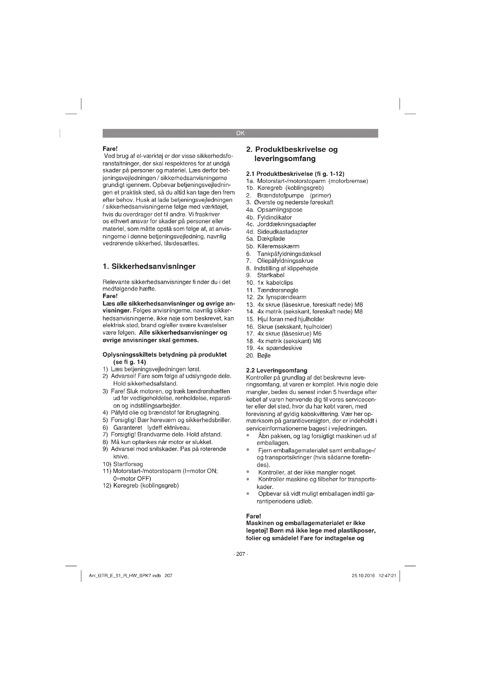 ret. Sikkerhedskontrol motorstart-/motorstop- greb For at sikre en uønsket start af græsslåmaskinen samt et hurtigt stop af motor og kniv, hvis der opstår en farlig situation, skal denne udstyres Anl_GTR_E_51_R_HW_SPK7.indb 209Anl_GTR_E_51_R_HW_SPK7.indb 209 25.10.2016 12:47:2225.10.2016 12:47:22DK