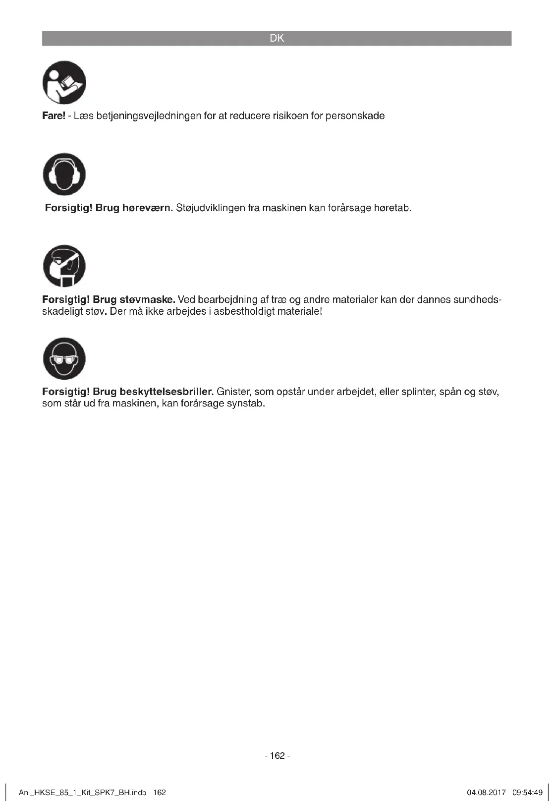 Fare! - Læs betjeningsvejledningen for at reducere risikoen for personskade Forsigtig! Brug høreværn. Støjudviklingen fra maskinen kan forårsage høretab. Forsigtig! Brug beskyttelsesbriller. Gnister, som opstår under arbejdet, eller splinter, spån og støv, som står ud fra maskinen, kan forårsage synstab. Forsigtig! Brug støvmaske. Ved bearbejdning af træ og andre materialer kan der dannes sundheds- skadeligt støv. Der må ikke arbejdes i asbestholdigt materiale! Anl_HKSE_85_1_Kit_SPK7_BH.indb 162Anl_HKSE_85_1_Kit_SPK7_BH.indb 162 04.08.2017 09:54:4904.08.2017 09:54:49DK