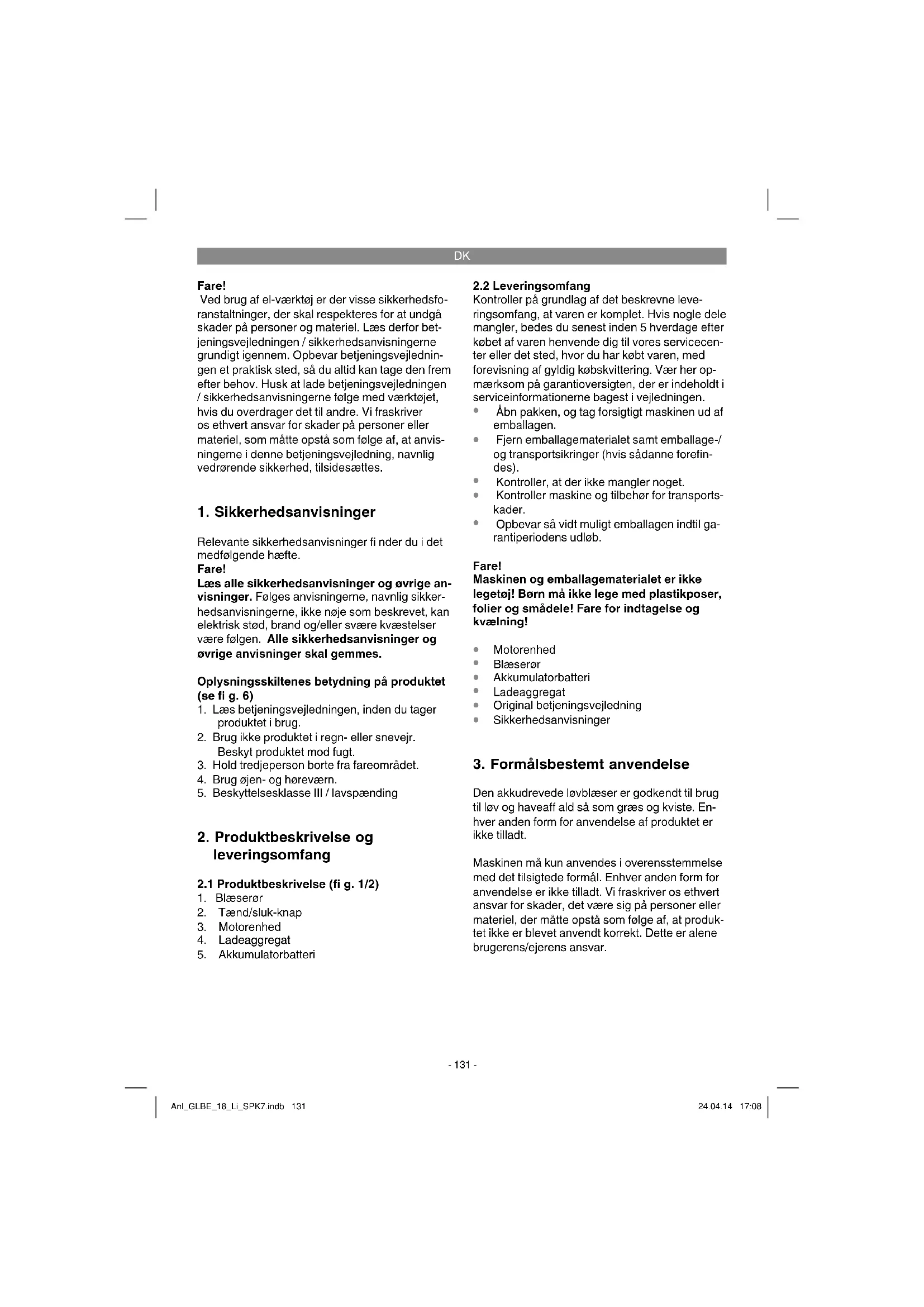 Den akkudrevede løvblæser er godkendt til brug til løv og haveaff ald så som græs og kviste. En- hver anden form for anvendelse af produktet er ikke tilladt. Maskinen må kun anvendes i overensstemmelse med det tilsigtede formål. Enhver anden form for anvendelse er ikke tilladt. Vi fraskriver os ethvert ansvar for skader, det være sig på personer eller materiel, der måtte opstå som følge af, at produk- tet ikke er blevet anvendt korrekt. Dette er alene brugerens/ejerens ansvar. Anl_GLBE_18_Li_SPK7.indb 131Anl_GLBE_18_Li_SPK7.indb 131 24.04.14 17:0824.04.14 17:08DK