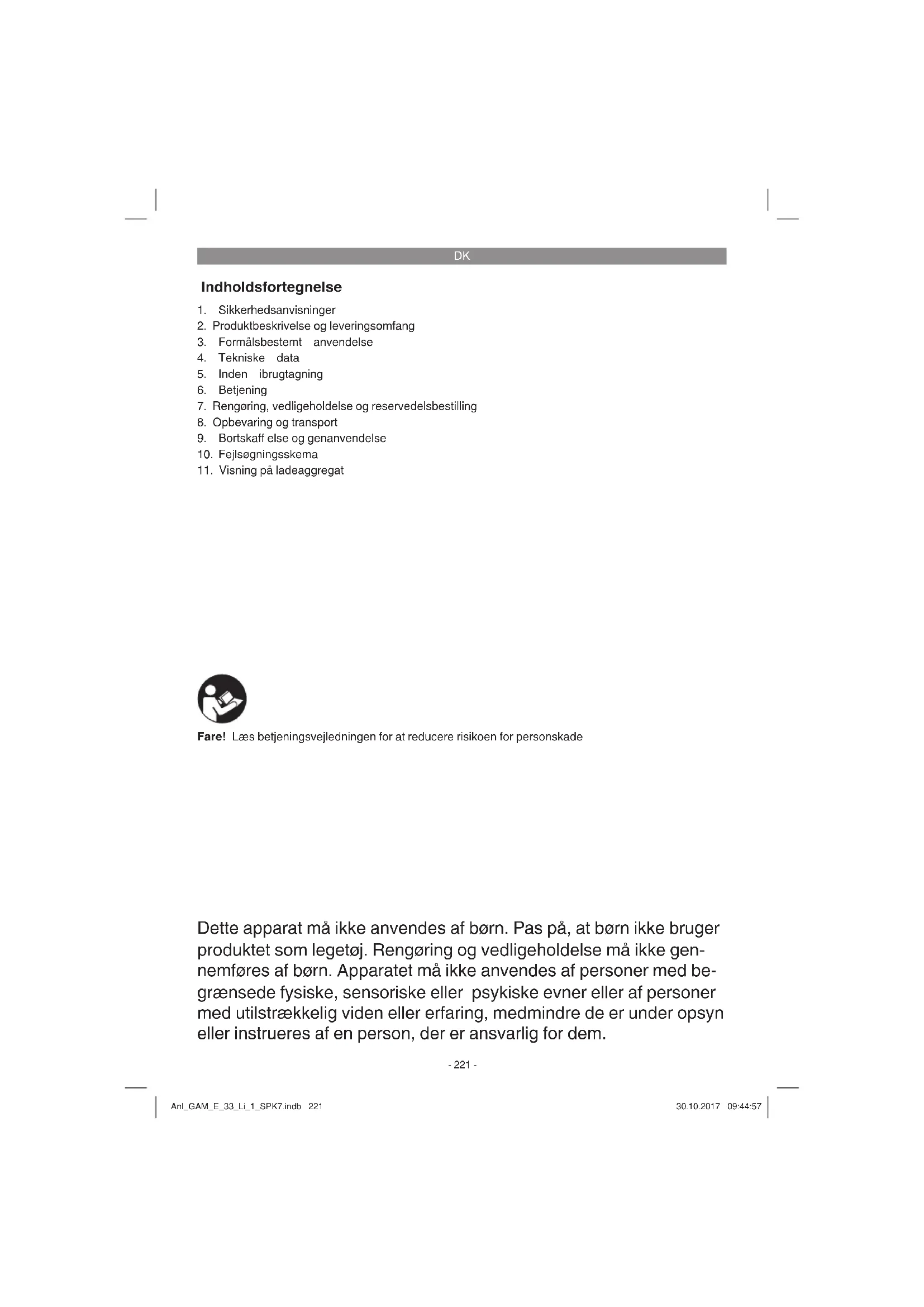 Dette apparat må ikke anvendes af børn. Pas på, at børn ikke bruger produktet som legetøj. Rengøring og vedligeholdelse må ikke gen- nemføres af børn. Apparatet må ikke anvendes af personer med be- grænsede fysiske, sensoriske eller psykiske evner eller af personer med utilstrækkelig viden eller erfaring, medmindre de er under opsyn eller instrueres af en person, der er ansvarlig for dem. Fare! Læs betjeningsvejledningen for at reducere risikoen for personskade Anl_GAM_E_33_Li_1_SPK7.indb 221Anl_GAM_E_33_Li_1_SPK7.indb 221 30.10.2017 09:44:5730.10.2017 09:44:57DK