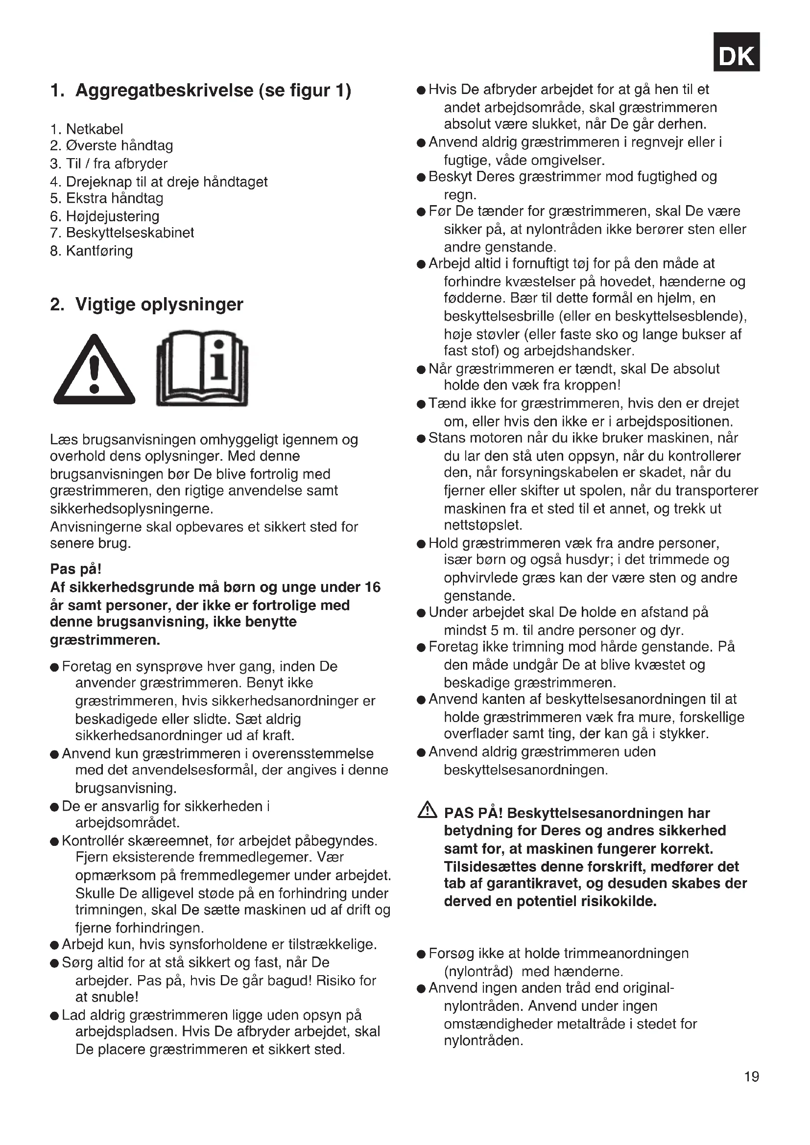 Læs brugsanvisningen omhyggeligt igennem og overhold dens oplysninger. Med denne brugsanvisningen bør De blive fortrolig med græstrimmeren, den rigtige anvendelse samt sikkerhedsoplysningerne. Anvisningerne skal opbevares et sikkert sted for senere brug. Pas på! Af sikkerhedsgrunde må børn og unge under 16 år samt personer, der ikke er fortrolige med denne brugsanvisning, ikke benytte græstrimmeren. Foretag en synsprøve hver gang, inden De anvender græstrimmeren. Benyt ikke græstrimmeren, hvis sikkerhedsanordninger er beskadigede eller slidte. Sæt aldrig sikkerhedsanordninger ud af kraft. Anvend kun græstrimmeren i overensstemmelse med det anvendelsesformål, der angives i denne brugsanvisning. De er ansvarlig for sikkerheden i arbejdsområdet. Kontrollér skæreemnet, før arbejdet påbegyndes. Fjern eksisterende fremmedlegemer. Vær opmærksom på fremmedlegemer under arbejdet. Skulle De alligevel støde på en forhindring under trimningen, skal De sætte maskinen ud af drift og fjerne forhindringen. Arbejd kun, hvis synsforholdene er tilstrækkelige. Sørg altid for at stå sikkert og fast, når De arbejder. Pas på, hvis De går bagud! Risiko for at snuble! Lad aldrig græstrimmeren ligge uden opsyn på arbejdspladsen. Hvis De afbryder arbejdet, skal De placere græstrimmeren et sikkert sted. Hvis De afbryder arbejdet for at gå hen til et andet arbejdsområde, skal græstrimmeren absolut være slukket, når De går derhen. Anvend aldrig græstrimmeren i regnvejr eller i fugtige, våde omgivelser. Beskyt Deres græstrimmer mod fugtighed og regn. Før De tænder for græstrimmeren, skal De være sikker på, at nylontråden ikke berører sten eller andre genstande. Arbejd altid i fornuftigt tøj for på den måde at forhindre kvæstelser på hovedet, hænderne og fødderne. Bær til dette formål en hjelm, en beskyttelsesbrille (eller en beskyttelsesblende), høje støvler (eller faste sko og lange bukser af fast stof) og arbejdshandsker. Når græstrimmeren er tændt, skal De absolut holde den væk fra kroppen! Tænd ikke for græstrimmeren, hvis den er drejet om, eller hvis den ikke er i arbejdspositionen. Stans motoren når du ikke bruker maskinen, når du lar den stå uten oppsyn, når du kontrollerer den, når forsyningskabelen er skadet, når du fjerner eller skifter ut spolen, når du transporterer maskinen fra et sted til et annet, og trekk ut nettstøpslet. Hold græstrimmeren væk fra andre personer, især børn og også husdyr; i det trimmede og ophvirvlede græs kan der være sten og andre genstande. Under arbejdet skal De holde en afstand på mindst 5 m. til andre personer og dyr. Foretag ikke trimning mod hårde genstande. På den måde undgår De at blive kvæstet og beskadige græstrimmeren. Anvend kanten af beskyttelsesanordningen til at holde græstrimmeren væk fra mure, forskellige overflader samt ting, der kan gå i stykker. Anvend aldrig græstrimmeren uden beskyttelsesanordningen. PAS PÅ! Beskyttelsesanordningen har betydning for Deres og andres sikkerhed samt for, at maskinen fungerer korrekt. Tilsidesættes denne forskrift, medfører det tab af garantikravet, og desuden skabes der derved en potentiel risikokilde. Forsøg ikke at holde trimmeanordningen (nylontråd) med hænderne. Anvend ingen anden tråd end original- nylontråden. Anvend under ingen omstændigheder metaltråde i stedet for nylontråden. DK20 Vær forsigtig med beskadigelser på anordningen, som bruges til at skære trådlængderne af. Sørg for, at luftåbninger er fri for snavs. Træk stikket ud efter brug og kontrollér maskinen for beskadigelser. Forsøg ikke at trimme græs, som ikke vokser på jorden; forsøg for eksempel ikke at trimme græs, der vokser på mure eller på sten osv. I græstrimmerens arbejdsområde er brugeren ansvarlig for skader over for tredjemand, som forårsages pga. græs-trimmerens anvendelse. Gå ikke over gader og grusveje med en tændt græstrimmer. Når De ikke anvender græstrimmeren, skal De opbevare den på et tørt sted og utilgængeligt for børn. Anvend kun græstrimmeren på den måde, som er beskrevet i denne betjeningsvejledning og hold den altid lodret til jorden. Alle andre positioner er farlige. Kontrollér jævnligt, om skruerne er spændt rigtigt. Netspændingen skal svare til spændingen , der er angivet på mærkepladen. Tilslutningsledningen skal jævnligt undersøges for tegn på en skade eller aldring. Græstrimmeren må ikke benyttes, hvis tilslutningsledningens tilstand ikke er upåklagelig. De anvendte tilslutningsledninger må ikke være lettere end lette gummislangeled-ninger HO7RN- F efter DIN 57282/VDE 0282 og skal have en mindstediameter på 1,5 mm