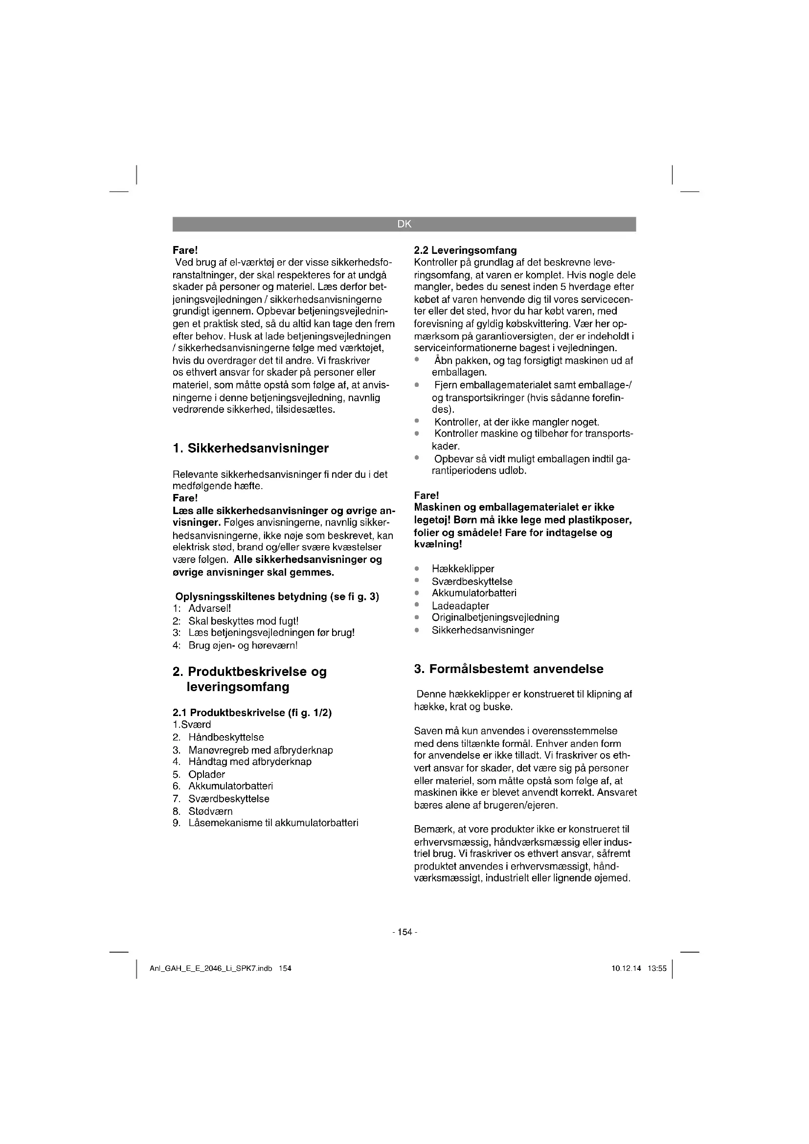 samt akkupack til vores kundeservice. Sørg for at genoplade akkupack’en i god tid for at sikre en lang levetid. Genopladning skal under alle omstændigheder ske, hvis du konstaterer, at akku-hækkeklippers ydelse er nedsat. Undgå, at akkupack’en afl ades helt. Det vil ødelægge akkupack’en! Anl_GAH_E_E_2046_Li_SPK7.indb 155Anl_GAH_E_E_2046_Li_SPK7.indb 155 10.12.14 13:5510.12.14 13:55DK