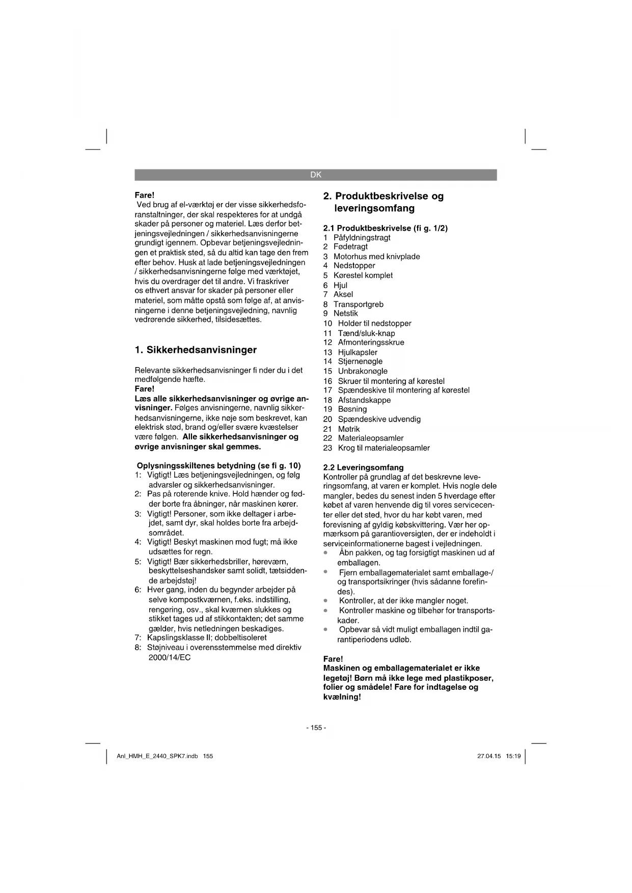 Opbevar så vidt muligt emballagen indtil ga- rantiperiodens udløb. Fare! Maskinen og emballagematerialet er ikke legetøj! Børn må ikke lege med plastikposer, folier og smådele! Fare for indtagelse og kvælning! Anl_HMH_E_2440_SPK7.indb 155Anl_HMH_E_2440_SPK7.indb 155 27.04.15 15:1927.04.15 15:19DK