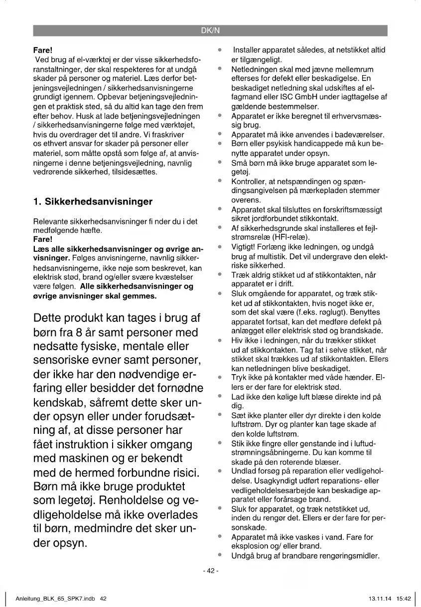 Relevante sikkerhedsanvisninger fi nder du i det medfølgende hæfte. Fare! Læs alle sikkerhedsanvisninger og øvrige an- visninger. Følges anvisningerne, navnlig sikker- hedsanvisningerne, ikke nøje som beskrevet, kan elektrisk stød, brand og/eller svære kvæstelser være følgen. Alle sikkerhedsanvisninger og øvrige anvisninger skal gemmes. Dette produkt kan tages i brug af børn fra 8 år samt personer med nedsatte fysiske, mentale eller sensoriske evner samt personer, der ikke har den nødvendige er- faring eller besidder det fornødne kendskab, såfremt dette sker un- der opsyn eller under forudsæt- ning af, at disse personer har fået instruktion i sikker omgang med maskinen og er bekendt med de hermed forbundne risici. Børn må ikke bruge produktet som legetøj. Renholdelse og ve- dligeholdelse må ikke overlades til børn, medmindre det sker un- der opsyn.
