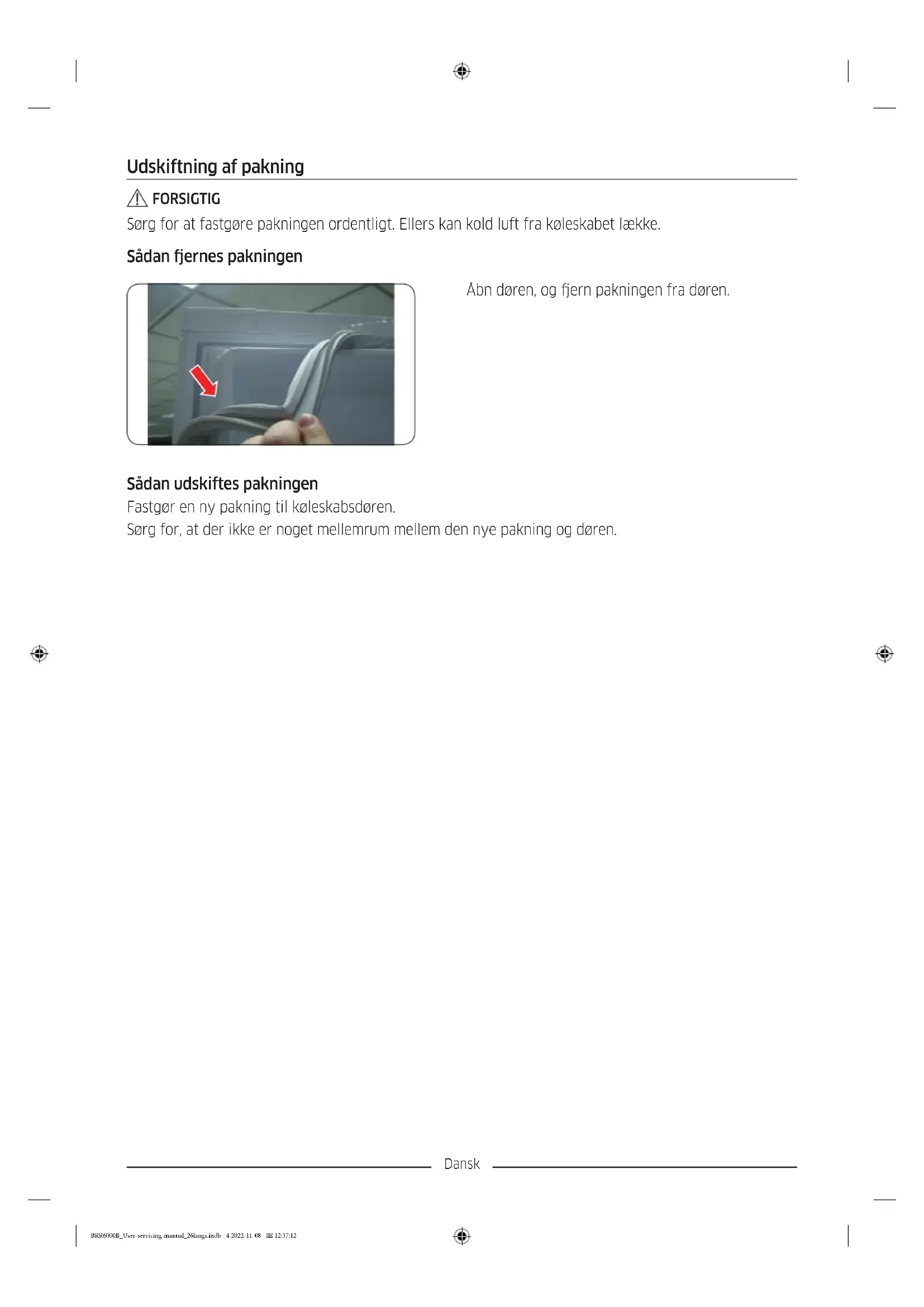 01 Hovedpanel 02 Hylde 03 Skuffe (Normal/stor) 04 Stregkodeetiket BRR6000B_User-servicing-manual_26langs.indb 3 2022-11-08 12:37:12Dansk Udskiftning af pakning FORSIGTIG Sørg for at fastgøre pakningen ordentligt. Ellers kan kold luft fra køleskabet lække. Sådan ernes pakningen Åbn døren, og ern pakningen fra døren. Sådan udskiftes pakningen Fastgør en ny pakning til køleskabsdøren. Sørg for, at der ikke er noget mellemrum mellem den nye pakning og døren. BRR6000B_User-servicing-manual_26langs.indb 4 2022-11-08 12:37:12Dansk Udskiftning af skuffe FORSIGTIG Kontrollér, at skuffen er indsat korrekt i skinnen under samlingen. Sådan ernes skuffen Løft forsigtigt forsiden af skuffen op, og træk den ud. Sådan monteres skufferne igen Genmontering af skufferne følger den omvendte rækkefølge af deres respektive ernelsestrin. Udskiftning af hængsel For at udskifte hængslerne skal du først erne dørene. ADVARSEL