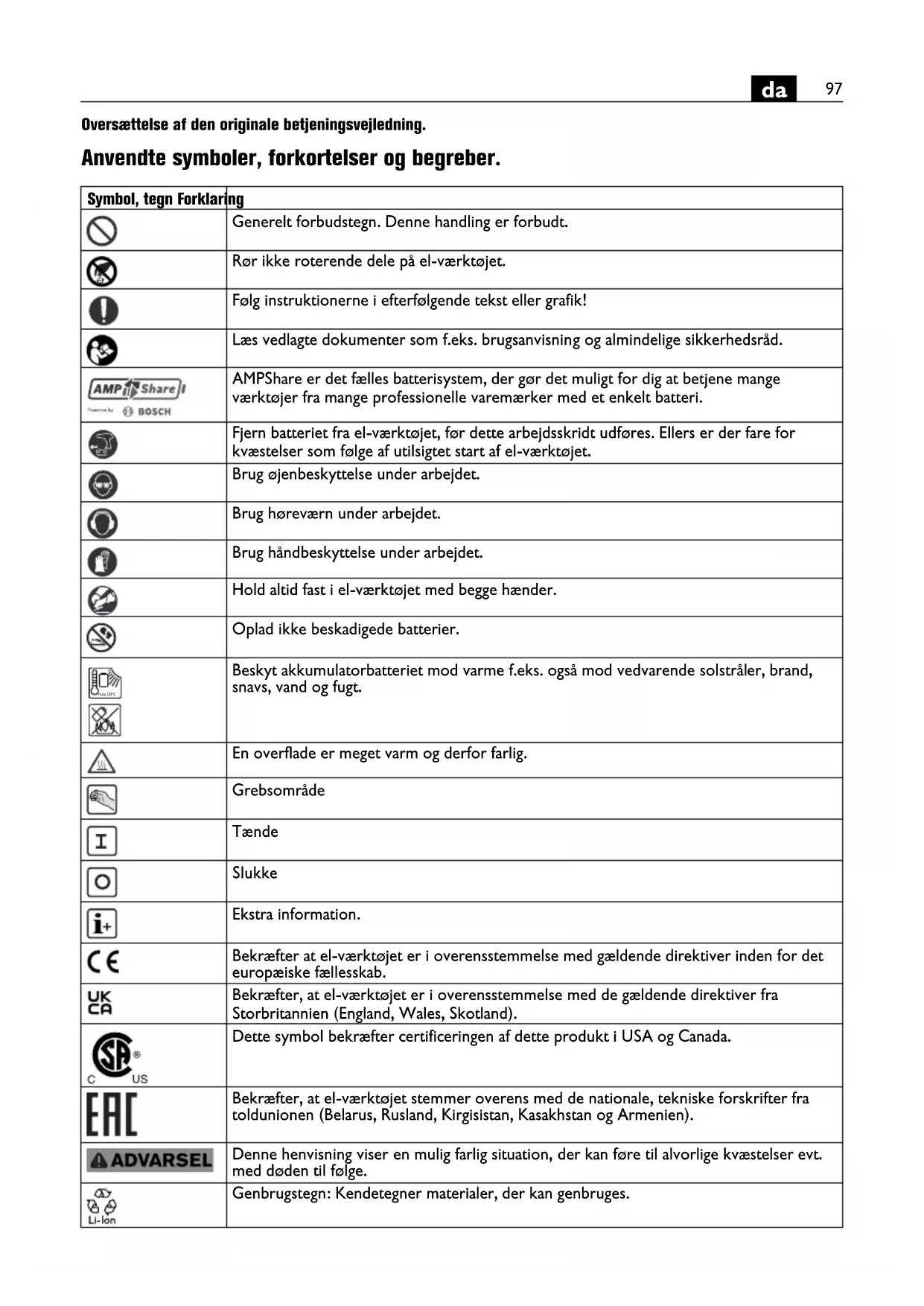 Oversættelse af den originale betjeningsvejledning. Anvendte symboler, forkortelser og begreber. Symbol, tegn Forklaring Generelt forbudstegn. Denne handling er forbudt. Rør ikke roterende dele på el-værktøjet. Følg instruktionerne i efterfølgende tekst eller grafik! Læs vedlagte dokumenter som f.eks. brugsanvisning og almindelige sikkerhedsråd. AMPShare er det fælles batterisystem, der gør det muligt for dig at betjene mange værktøjer fra mange professionelle varemærker med et enkelt batteri. Fjern batteriet fra el-værktøjet, før dette arbejdsskridt udføres. Ellers er der fare for kvæstelser som følge af utilsigtet start af el-værktøjet. Brug øjenbeskyttelse under arbejdet. Brug høreværn under arbejdet. Brug håndbeskyttelse under arbejdet. Hold altid fast i el-værktøjet med begge hænder. Oplad ikke beskadigede batterier. Beskyt akkumulatorbatteriet mod varme f.eks. også mod vedvarende solstråler, brand, snavs, vand og fugt. En overflade er meget varm og derfor farlig. Grebsområde Tænde Slukke Ekstra information. Bekræfter at el-værktøjet er i overensstemmelse med gældende direktiver inden for det europæiske fællesskab. Bekræfter, at el-værktøjet er i overensstemmelse med de gældende direktiver fra Storbritannien (England, Wales, Skotland). Dette symbol bekræfter certificeringen af dette produkt i USA og Canada. Bekræfter, at el-værktøjet stemmer overens med de nationale, tekniske forskrifter fra toldunionen (Belarus, Rusland, Kirgisistan, Kasakhstan og Armenien). Denne henvisning viser en mulig farlig situation, der kan føre til alvorlige kvæstelser evt. med døden til følge. Genbrugstegn: Kendetegner materialer, der kan genbruges. max.50°C98