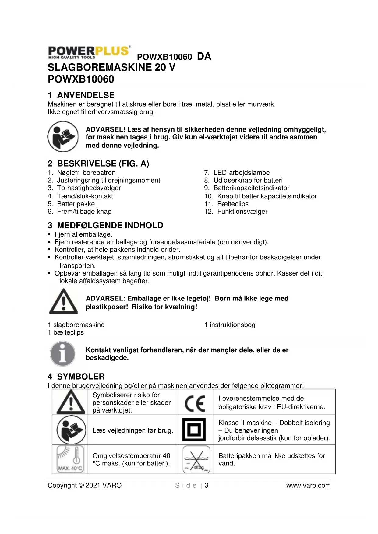 - Værktøjet skal oplades mindst en gang om måneden for at sikre, at det fungerer optimalt. 15 MILJØ Hvis maskinen skal skiftes ud efter lang tids brug, må den ikke bortskaffes som husholdningsaffald, men skal bortskaffes på en miljømæssigt forsvarlig måde. Maskinens enkelte dele må ikke bortskaffes som husholdningsaffald. Sørg for at genbruge disse, hvor der findes egnede anlæg til det. Kontakt de lokale myndigheder eller forhandleren for at få rådgivning om indsamling og bortskaffelse.POWXB10060 DA Copyright © 2021 VARO S i d e | 14 www.varo.com 16 KONFORMITETSERKLÆRING VARO – Vic. Van Rompuy N.V – Joseph Van Instraat 9 – BE2500 Lier – Belgien, erklærer hermed, at Apparatbeskrivelse: Slagboremaskine 20 V - Batteridrevet Varemærke: PowerPlus Varenummer: POWXB10060 er i overensstemmelse med de væsentlige krav og andre relevante bestemmelser i gældende europæiske direktiver, der er baseret på anvendelse af europæiske harmoniserede standarder. Enhver uautoriseret modifikation af apparatet ugyldiggør denne erklæring. EU-direktiver (herunder eventuelle tillæg frem til datoen for undertegnelsen): 2011/65/EU 2006/42/EC 2014/30/EU Harmoniserede europæiske standarder (herunder eventuelle tillæg frem til datoen for undertegnelsen): EN62841-1 : 2015 EN62841-2-1 : 2018 EN55014-1 : 2017 EN55014-2 : 2015 Indehaver af den tekniske dokumentation: Philippe Vankerkhove, VARO - Vic. Van Rompuy N.V. Undertegnede handler på vegne af selskabets administrerende direktør, Philippe Vankerkhove Regulatory Affairs (afdelingen for juridiske anliggender) – Compliance Manager 21/01/2021, Lier - BelgiumPOWXB10060 SV Copyright © 2021 VARO S i d a | 1 www.varo.com