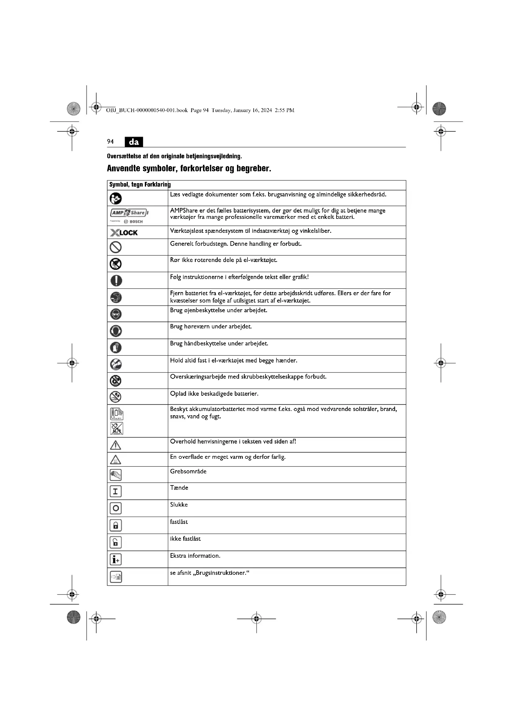 Oversættelse af den originale betjeningsvejledning. Anvendte symboler, forkortelser og begreber. Symbol, tegn Forklaring Læs vedlagte dokumenter som f.eks. brugsanvisning og almindelige sikkerhedsråd. AMPShare er det fælles batterisystem, der gør det muligt for dig at betjene mange værktøjer fra mange professionelle varemærker med et enkelt batteri. Værktøjsløst spændesystem til indsatsværktøj og vinkelsliber. Generelt forbudstegn. Denne handling er forbudt. Rør ikke roterende dele på el-værktøjet. Følg instruktionerne i efterfølgende tekst eller grafik! Fjern batteriet fra el-værktøjet, før dette arbejdsskridt udføres. Ellers er der fare for kvæstelser som følge af utilsigtet start af el-værktøjet. Brug øjenbeskyttelse under arbejdet. Brug høreværn under arbejdet. Brug håndbeskyttelse under arbejdet. Hold altid fast i el-værktøjet med begge hænder. Overskæringsarbejde med skrubbeskyttelseskappe forbudt. Oplad ikke beskadigede batterier. Beskyt akkumulatorbatteriet mod varme f.eks. også mod vedvarende solstråler, brand, snavs, vand og fugt. Overhold henvisningerne i teksten ved siden af! En overflade er meget varm og derfor farlig. Grebsområde Tænde Slukke fastlåst ikke fastlåst Ekstra information. se afsnit „Brugsinstruktioner.“ max.50°C OBJ_BUCH-0000000540-001.book Page 94 Tuesday, January 16, 2024 2:55 PM95
